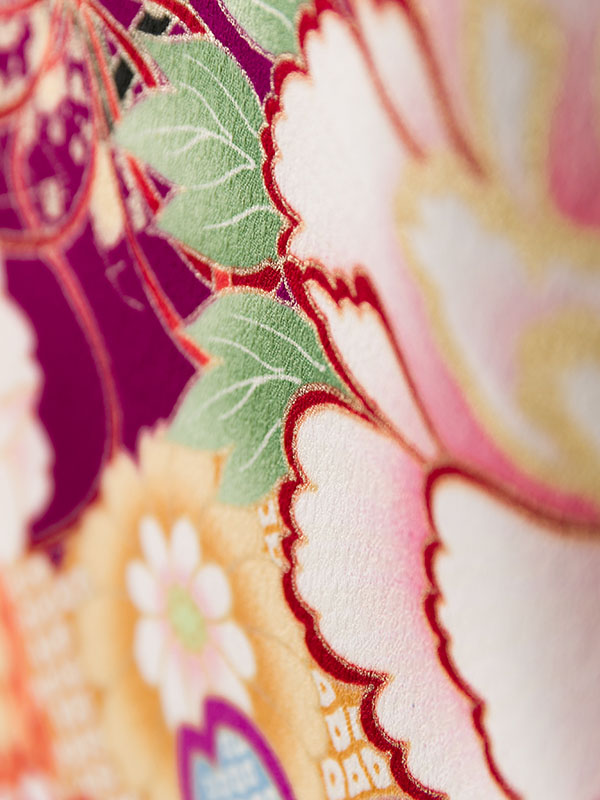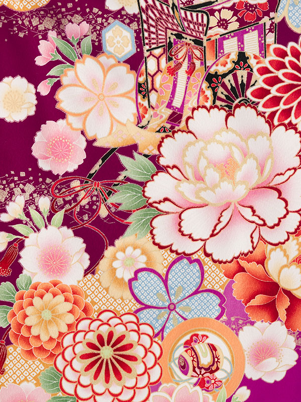 着物:赤紫地 牡丹 御所車