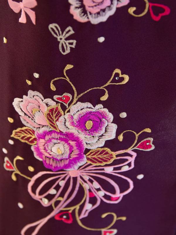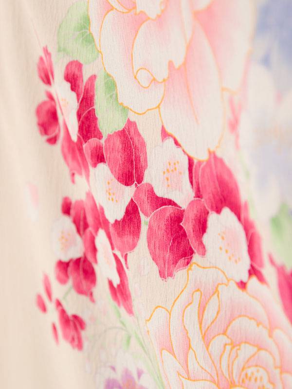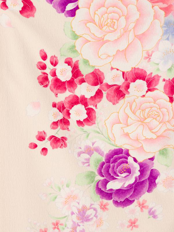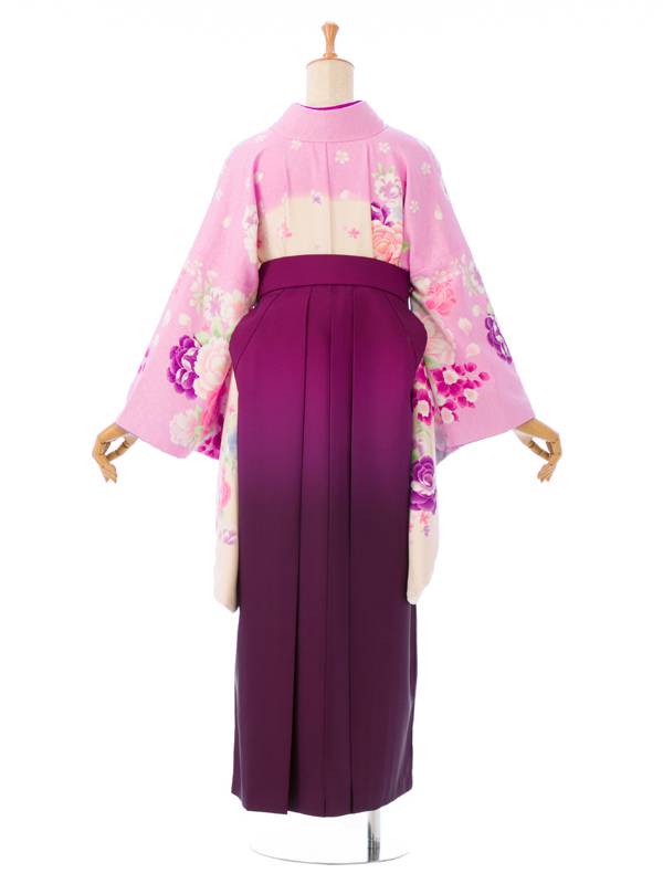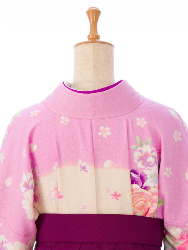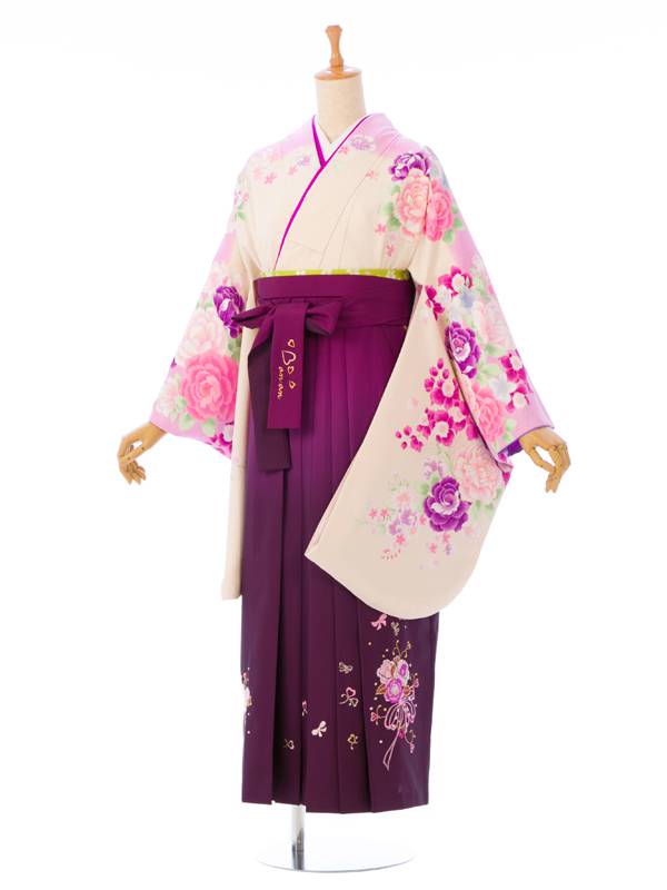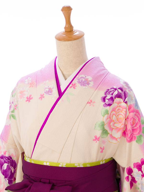 ■着物:クリーム地 ピンクぼかし 薔薇 八重桜■袴:ワインぼかし袴 薔薇 リボン刺繍