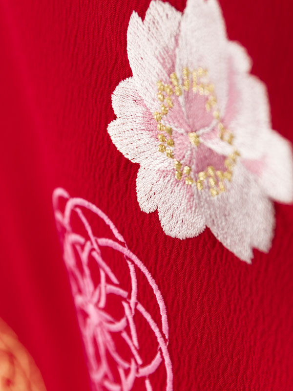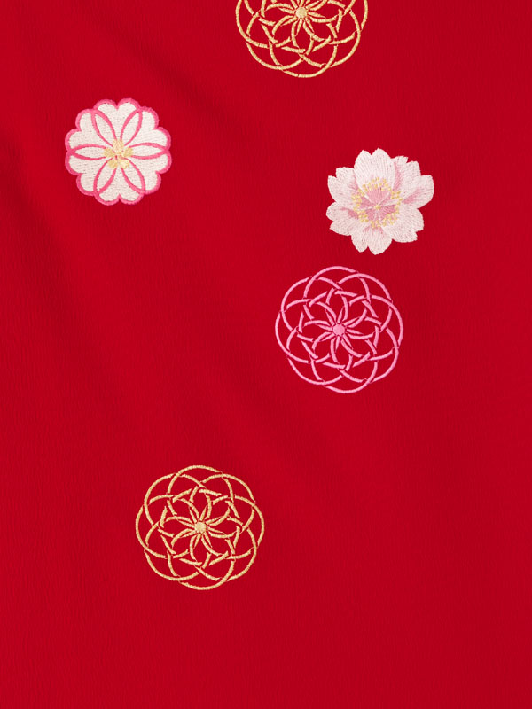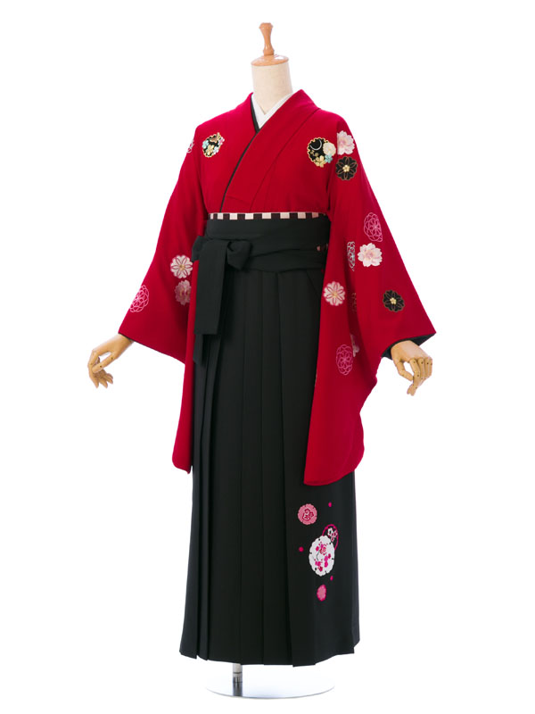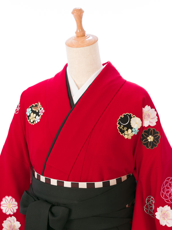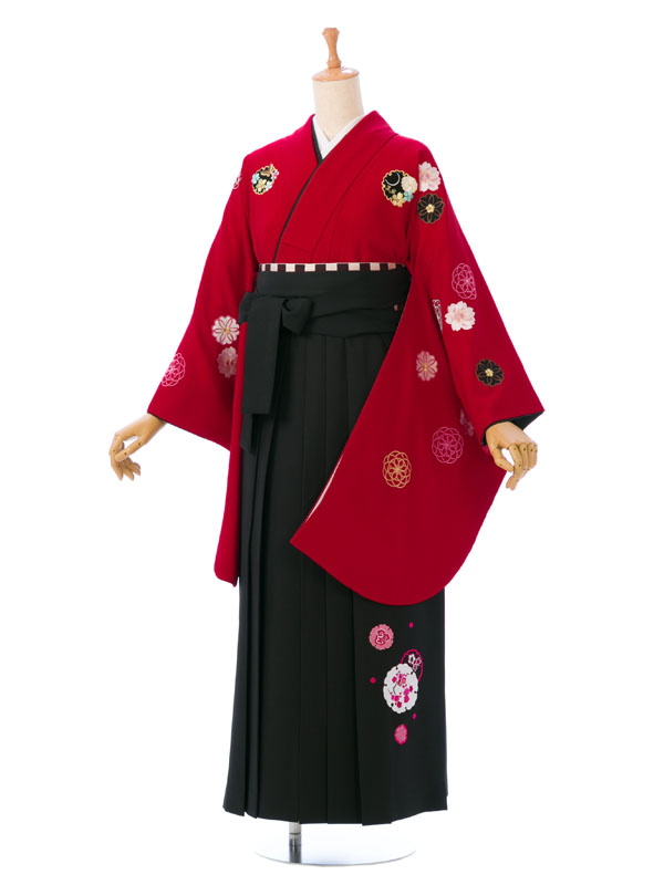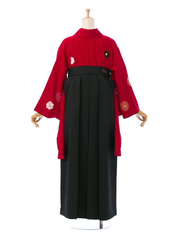 ■着物:JAPAN STYLE 赤地 刺繍の桜 花紋■袴:黒地 雪輪 花紋刺繍入り 2.5