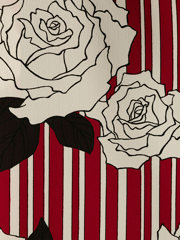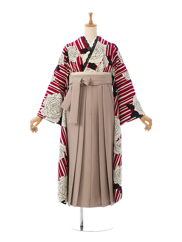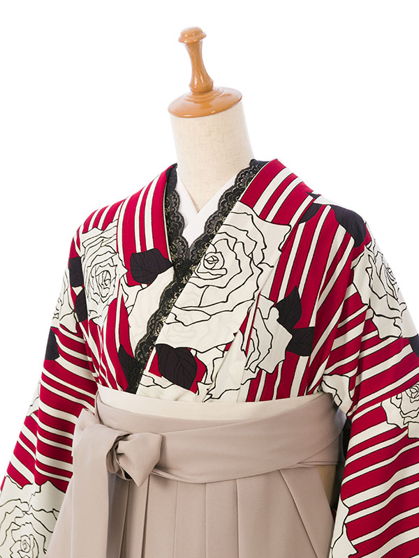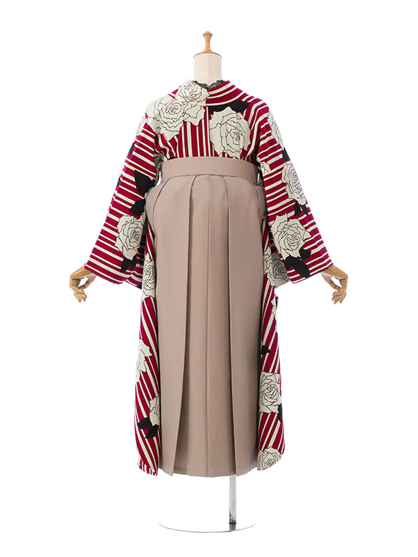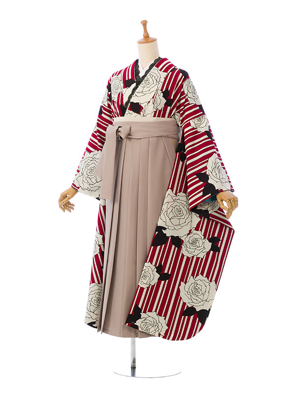 ■着物:赤×白縞に薔薇文様■袴:グレージュ袴 87cm