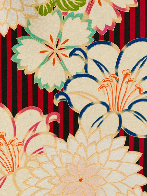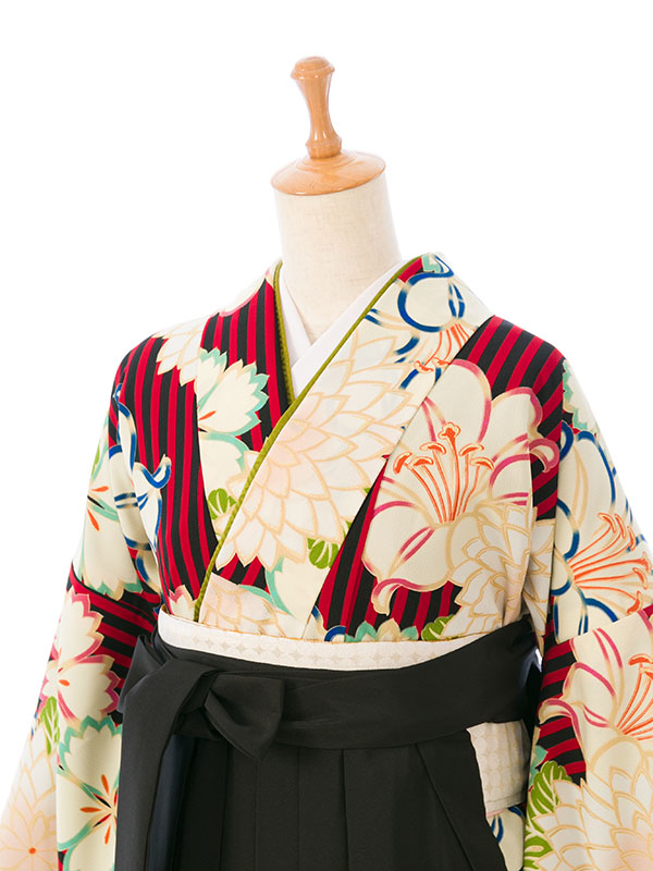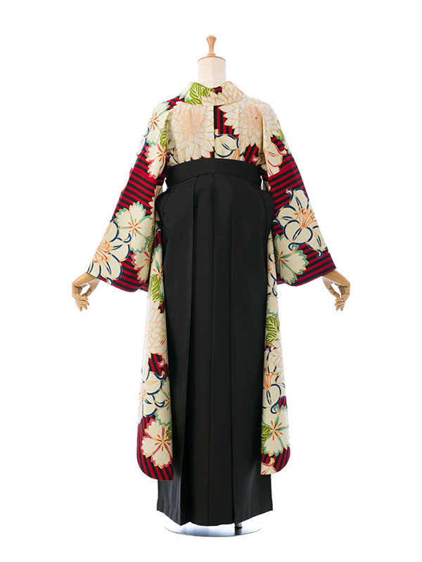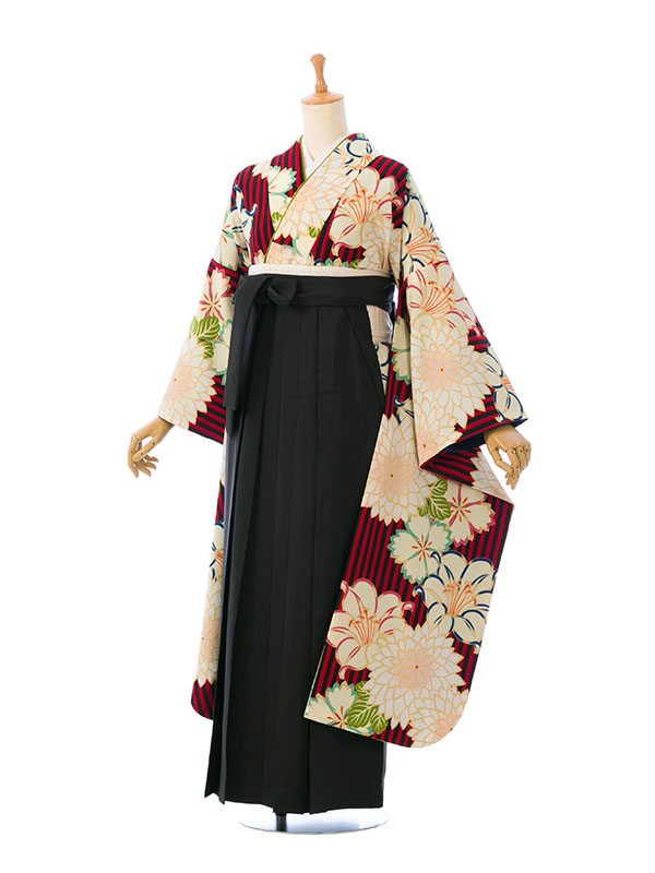 ■着物:赤/黒 縞に百合 菊■袴:黒袴 99cm