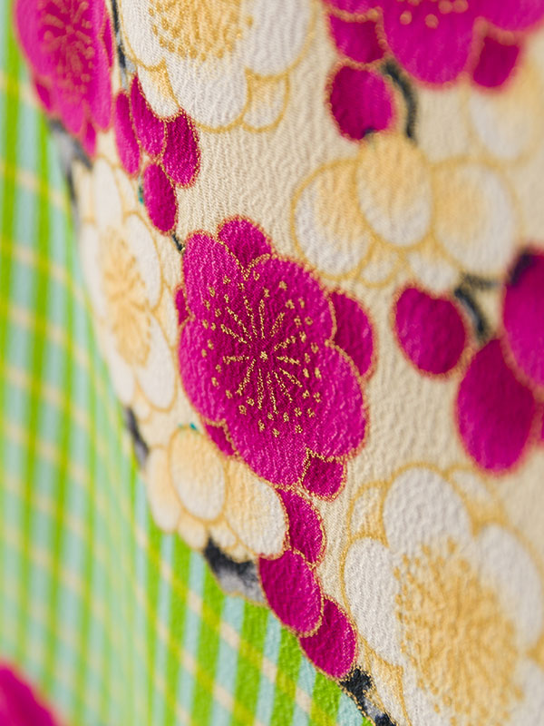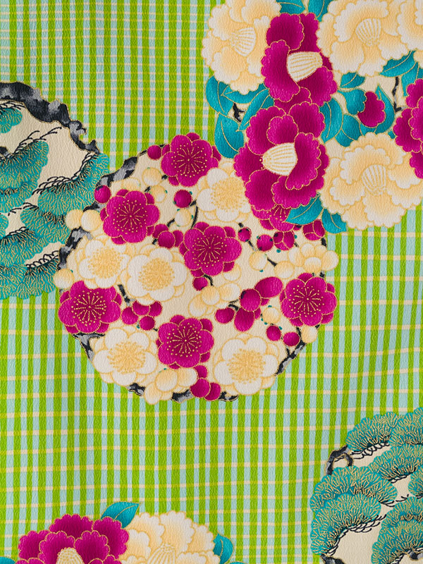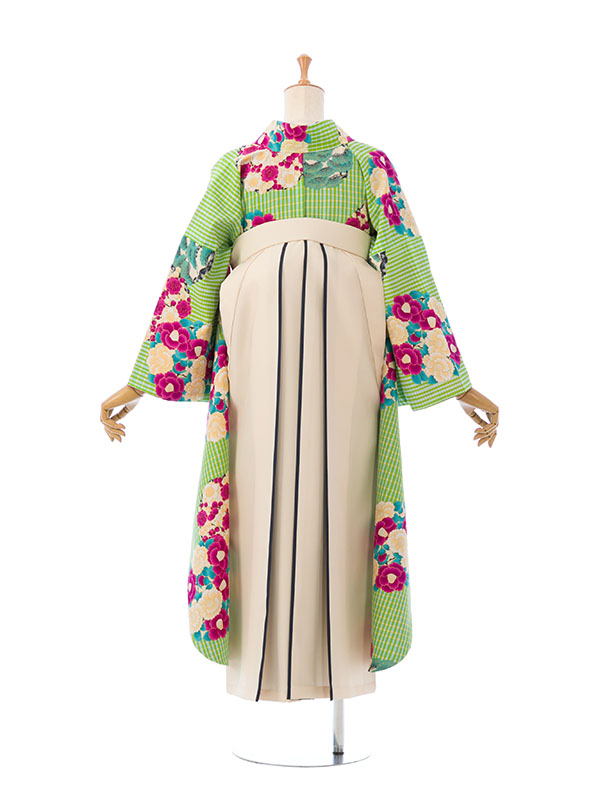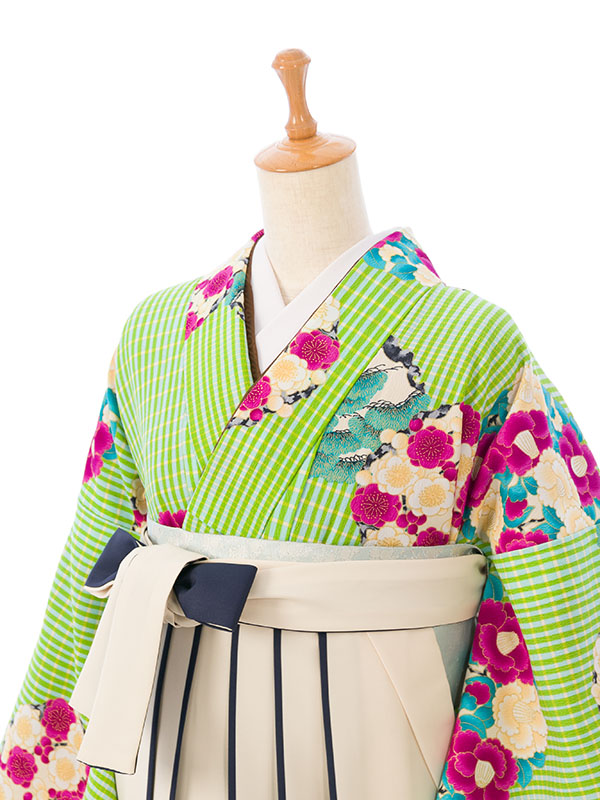 ■着物:黄緑地 格子に花の丸■袴:オフ白×紺色 バイカラー 91cm