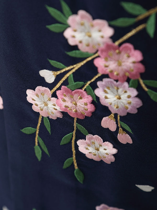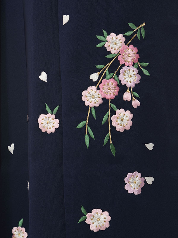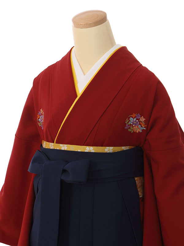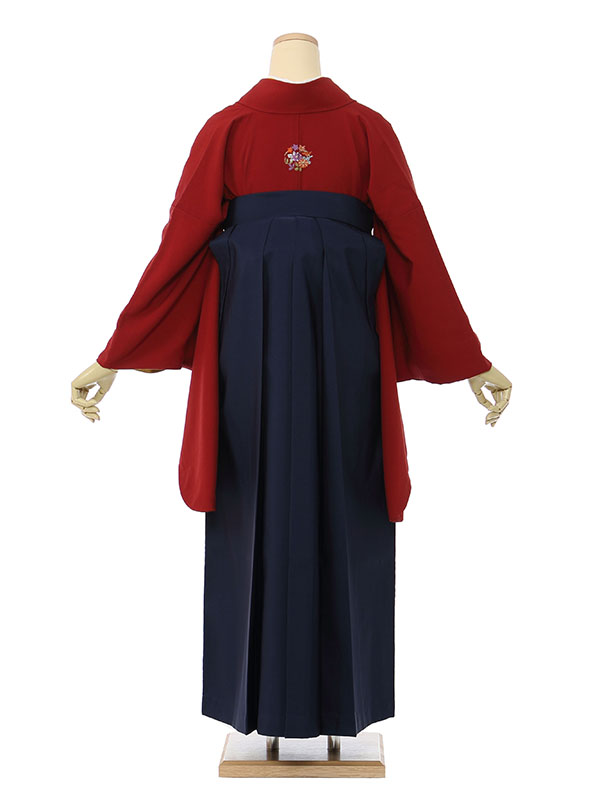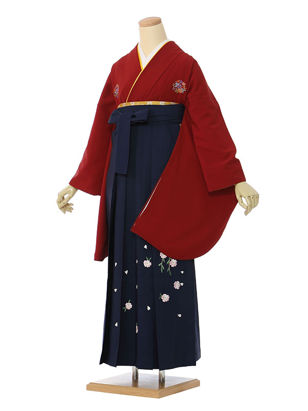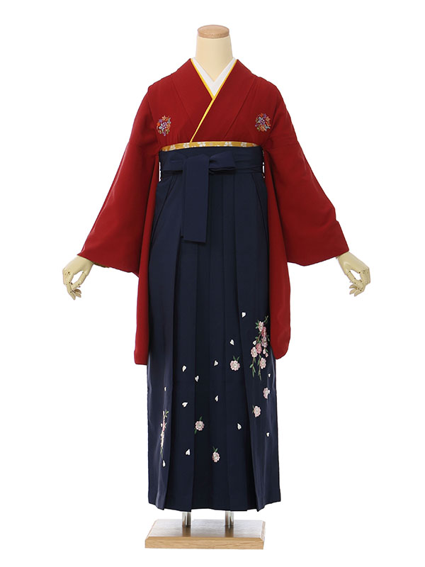着物:赤地 花紋 袴:紺地 桜刺繍
