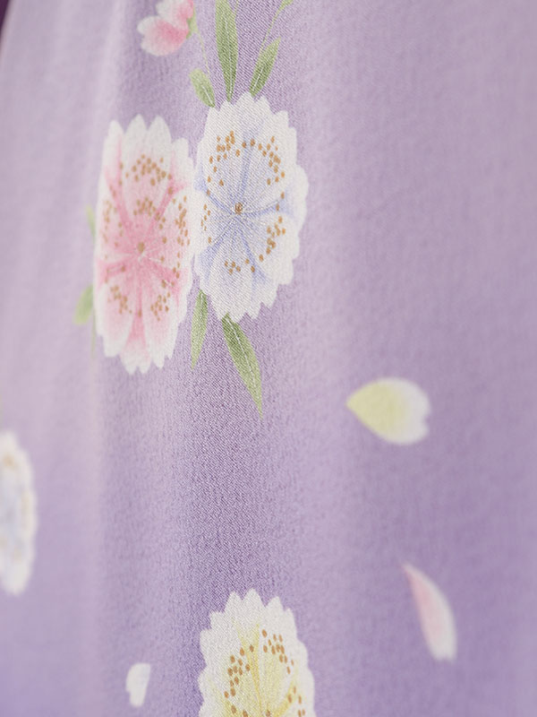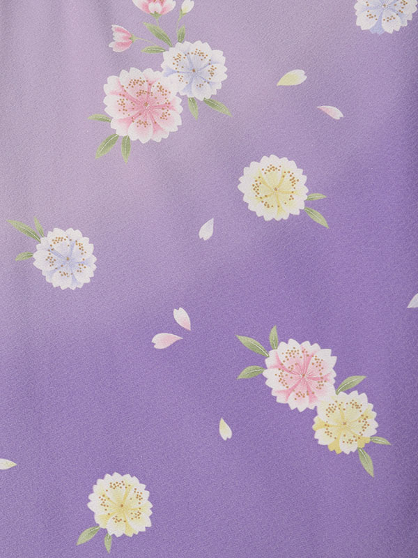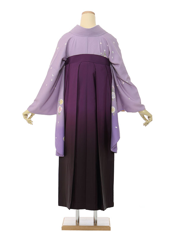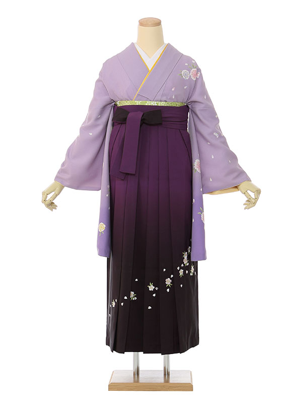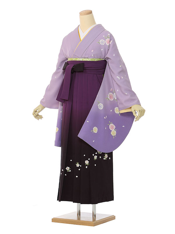着物: ラベンダー地 袖ぼかし 八重桜 袴: 紫ぼかし 桜刺繍