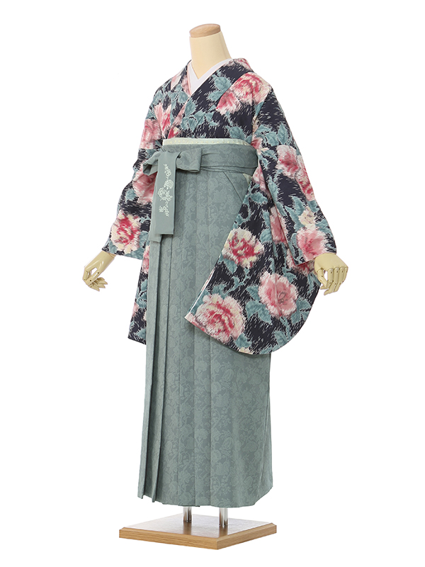 【着物色/柄】着物:黒地 ローズ GN-5 袴:ミント 花更紗 GH-2