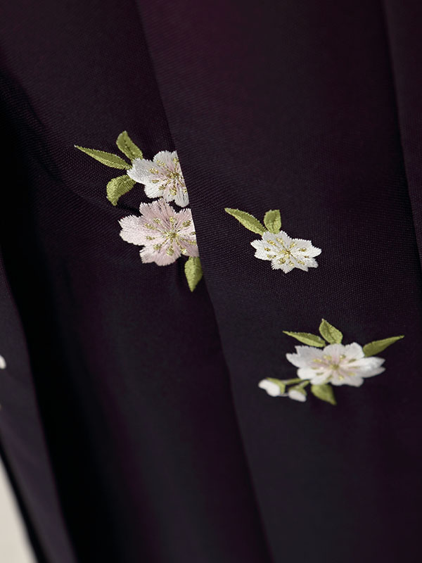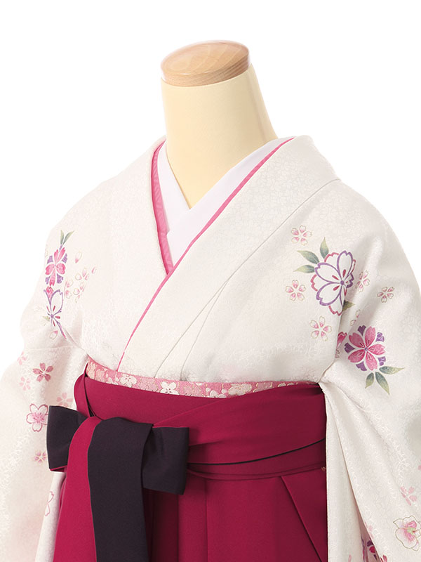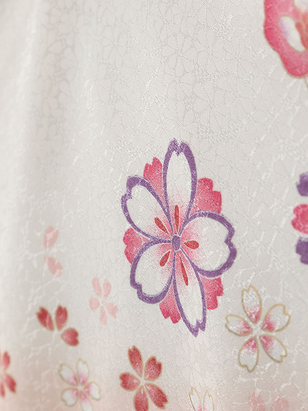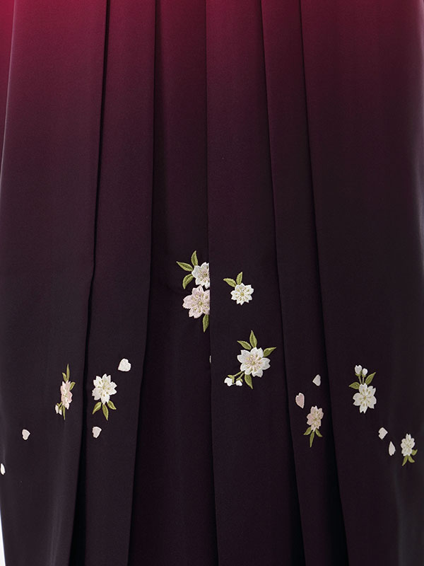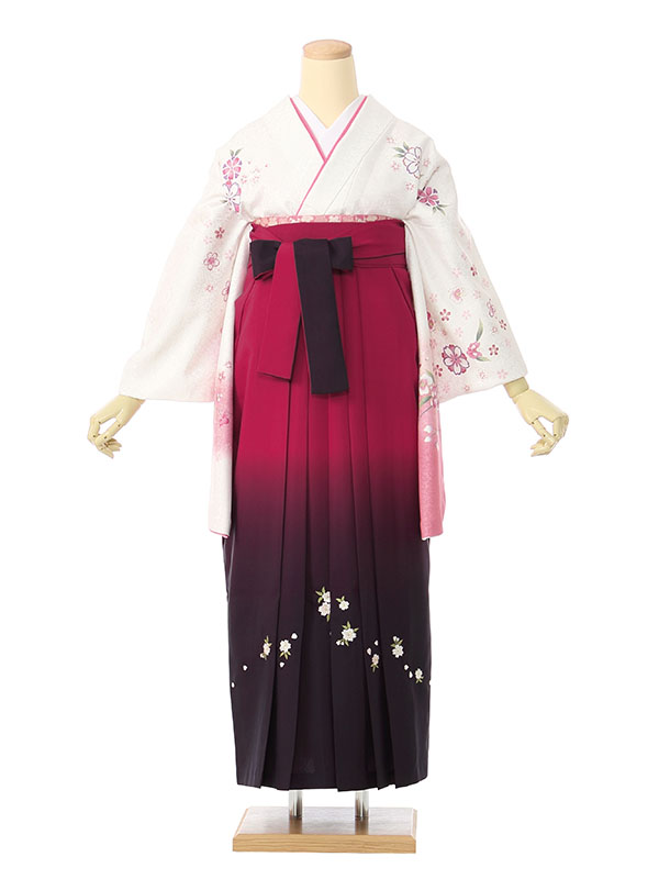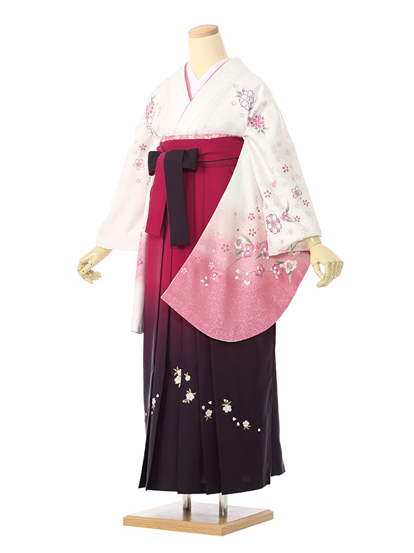 色/柄 着物:白地 袖ピンクぼかし 桜 袴:赤紫地 紫ぼかし 桜刺繍