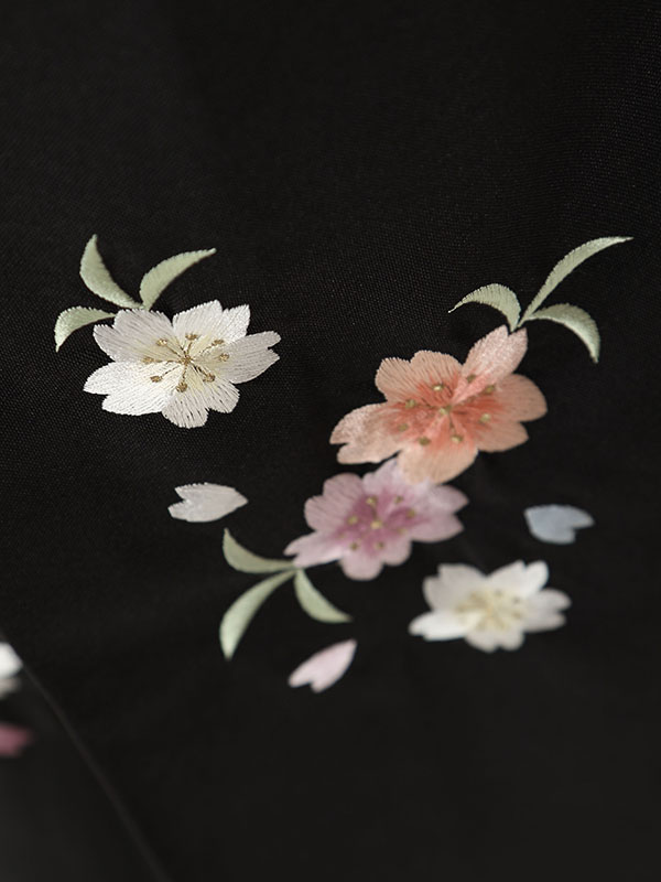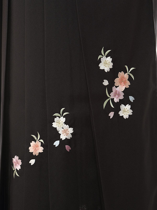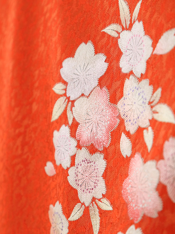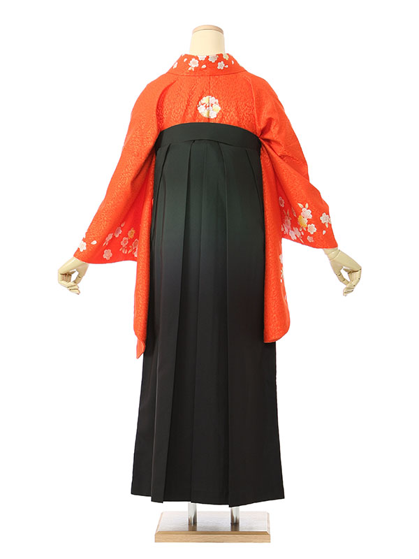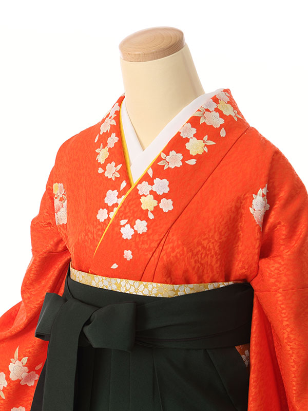 着物:オレンジ地 花紋 桜文様 袴:グリーンぼかし 桜刺繍
