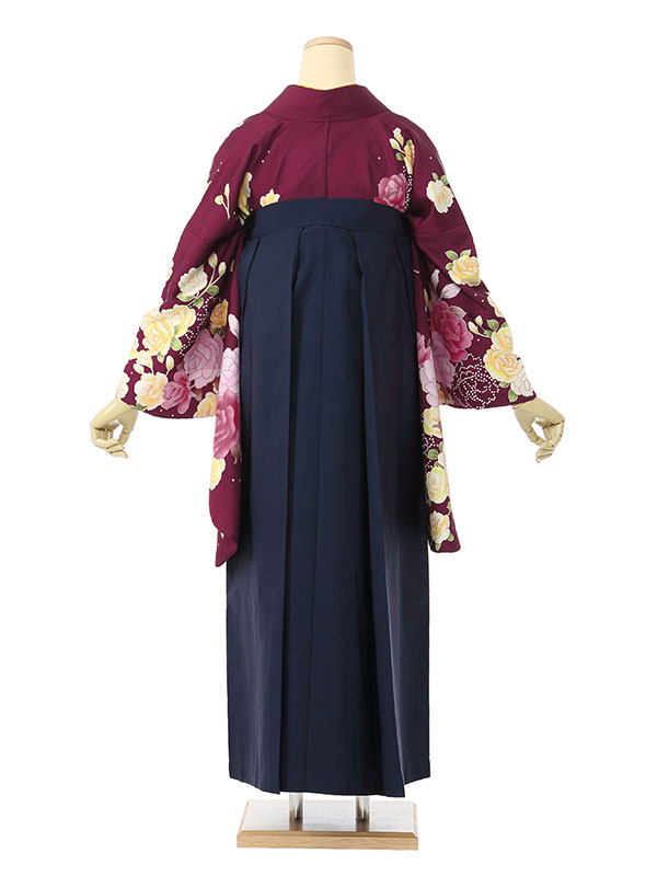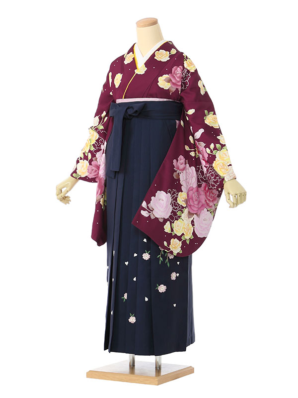 着物:紫地ピンクと黄色のバラ 袴:紺地 桜刺繍