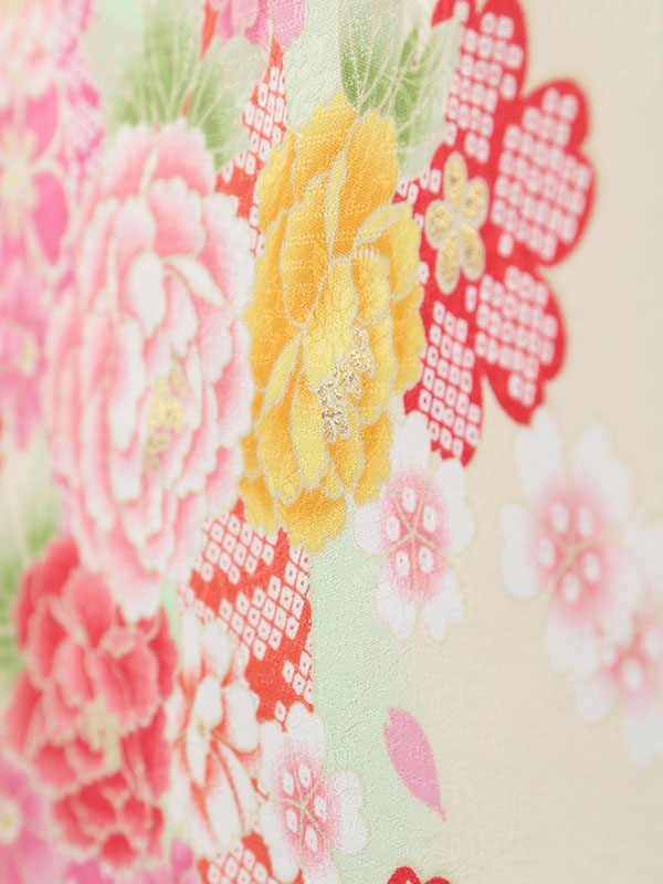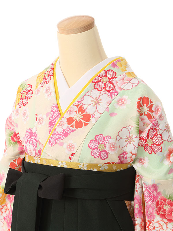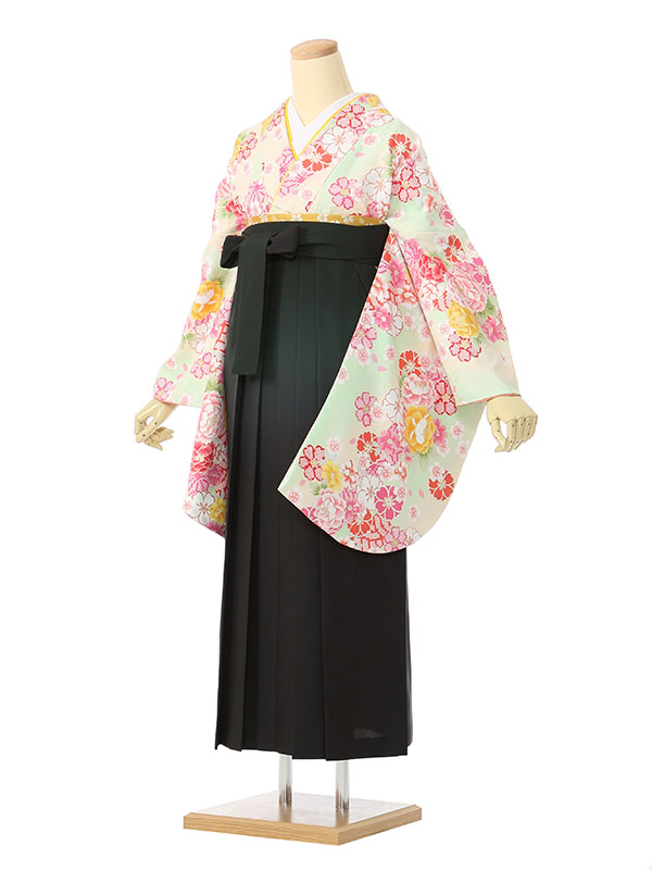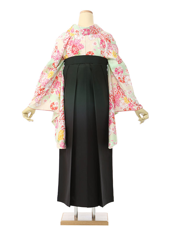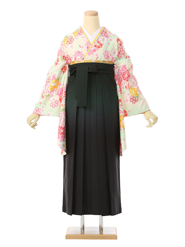 着物:パステルグリーン地に牡丹 桜 袴:グリーンぼかし袴