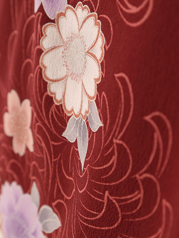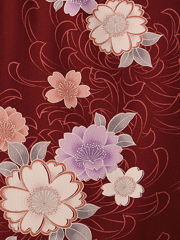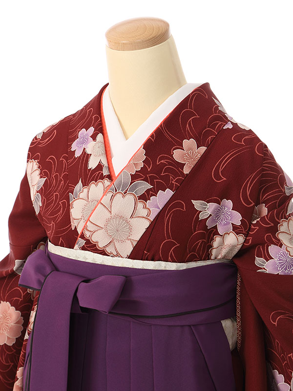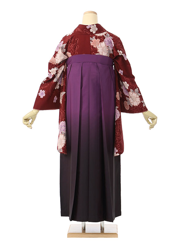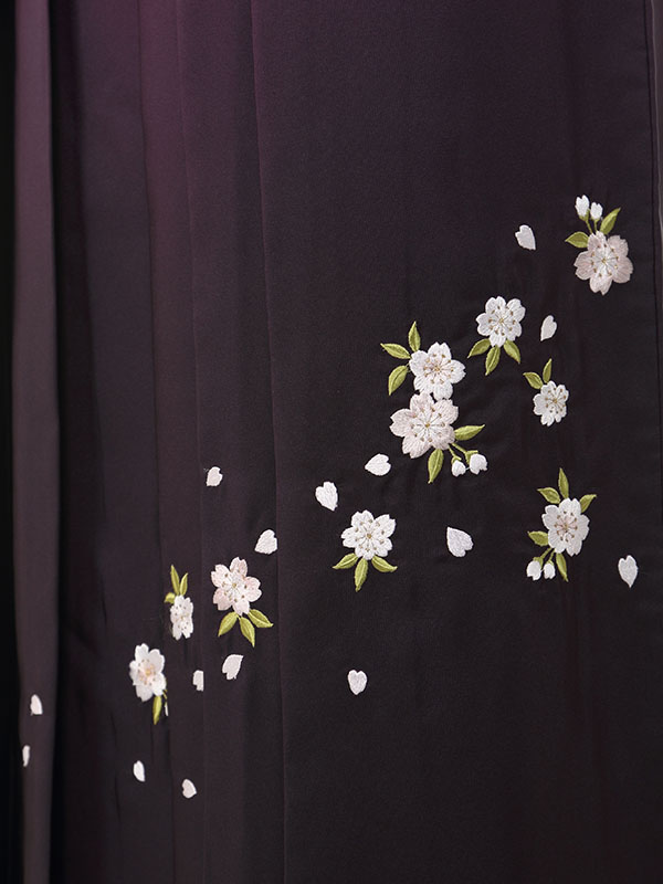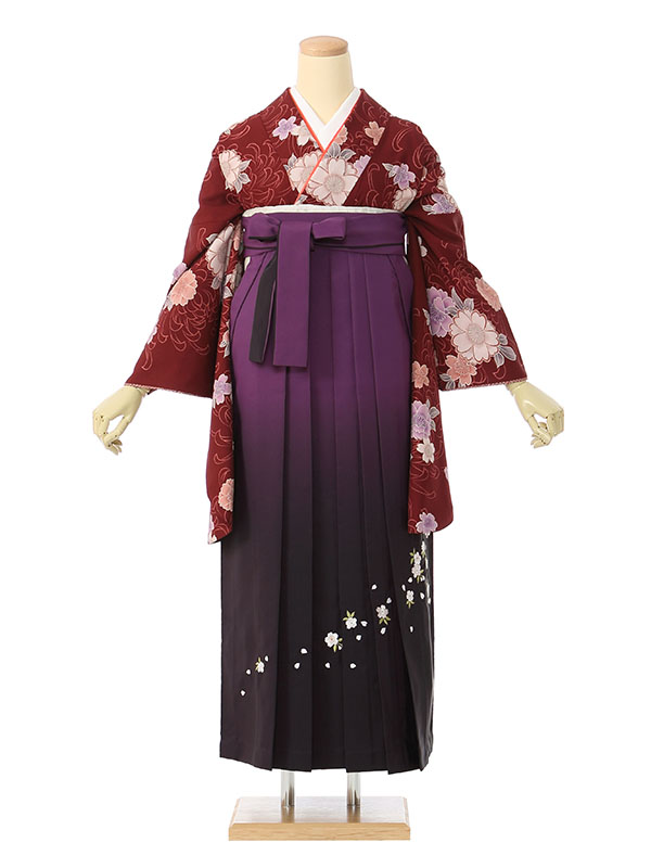 色/柄 着物:えび茶地 桜と乱菊 袴:紫ぼかし袴 小桜刺繍