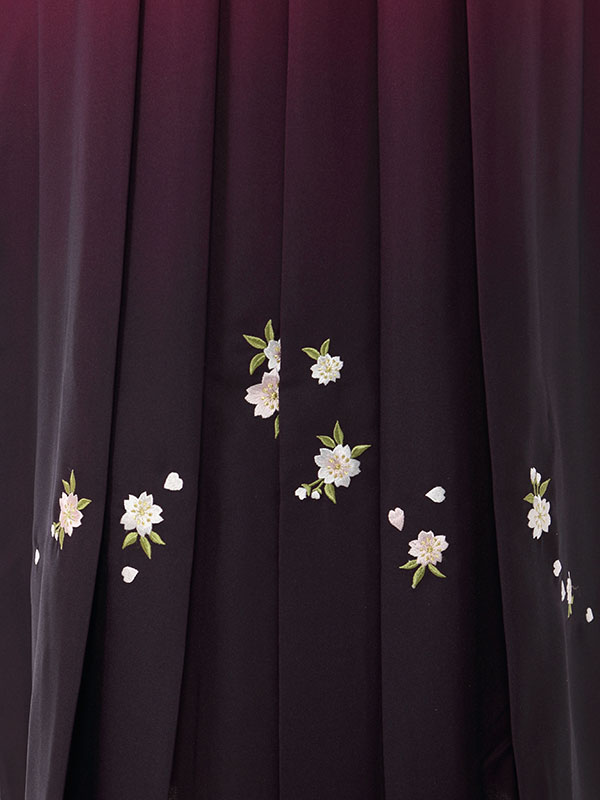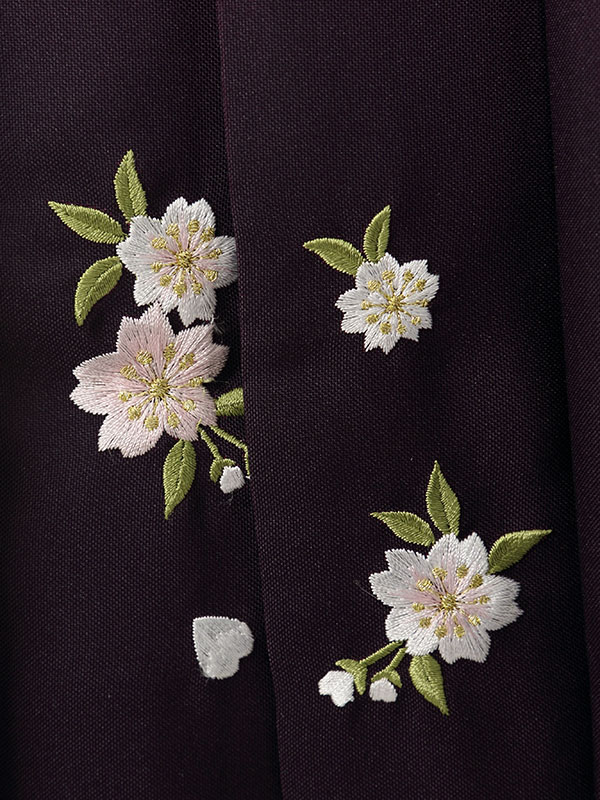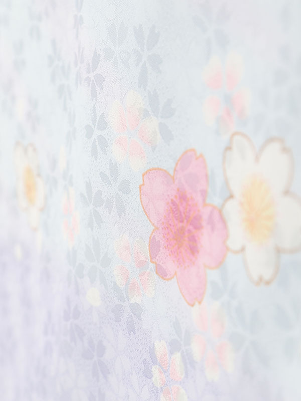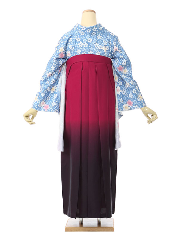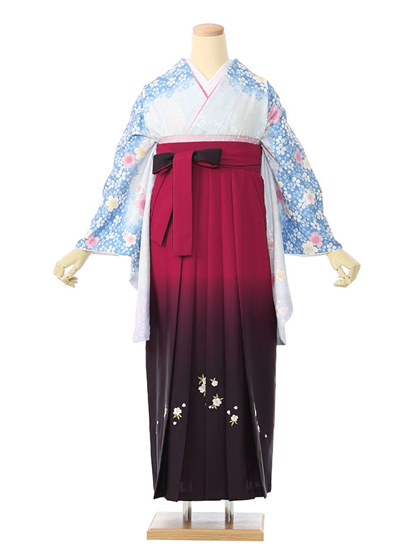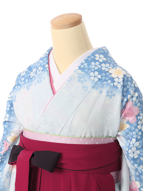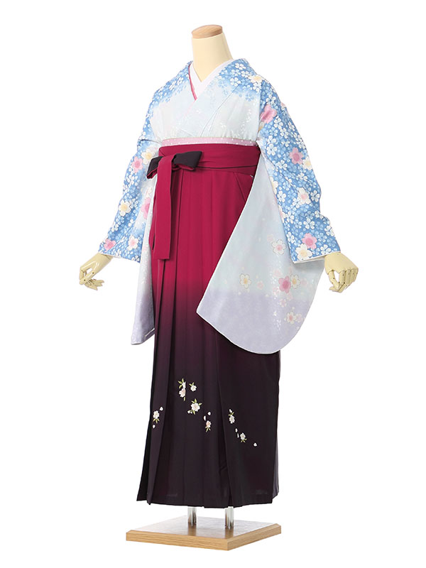 着物: 水色 桜地紋 深水色 桜 袴:赤紫地 紫ぼかし 桜刺繍