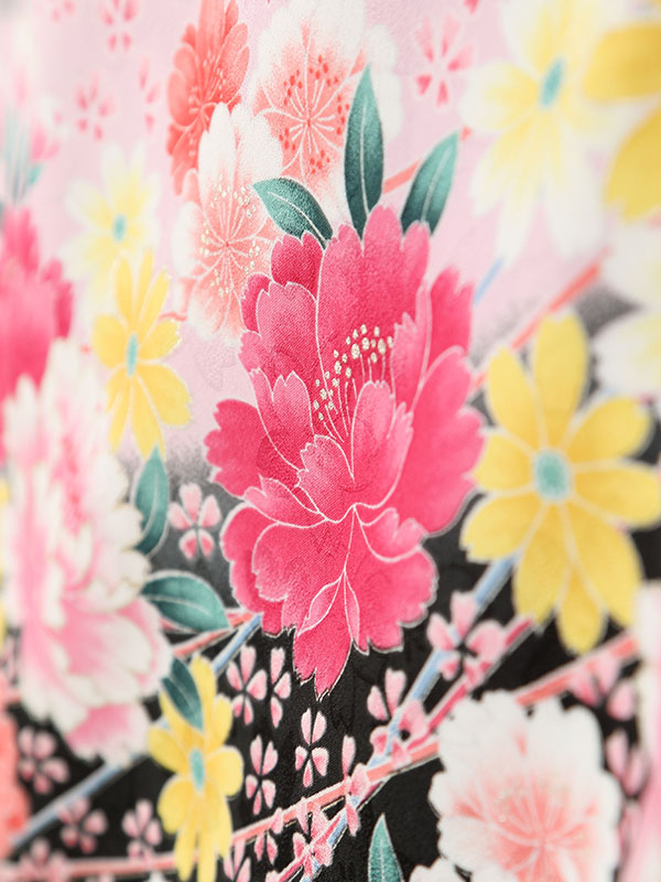 色/柄 着物:黒地 八重桜 桜 リボン 袴:ワインぼかし