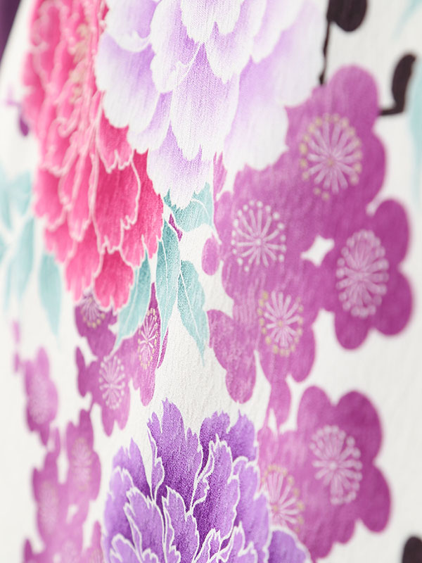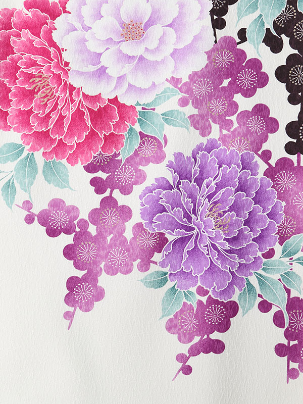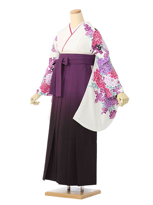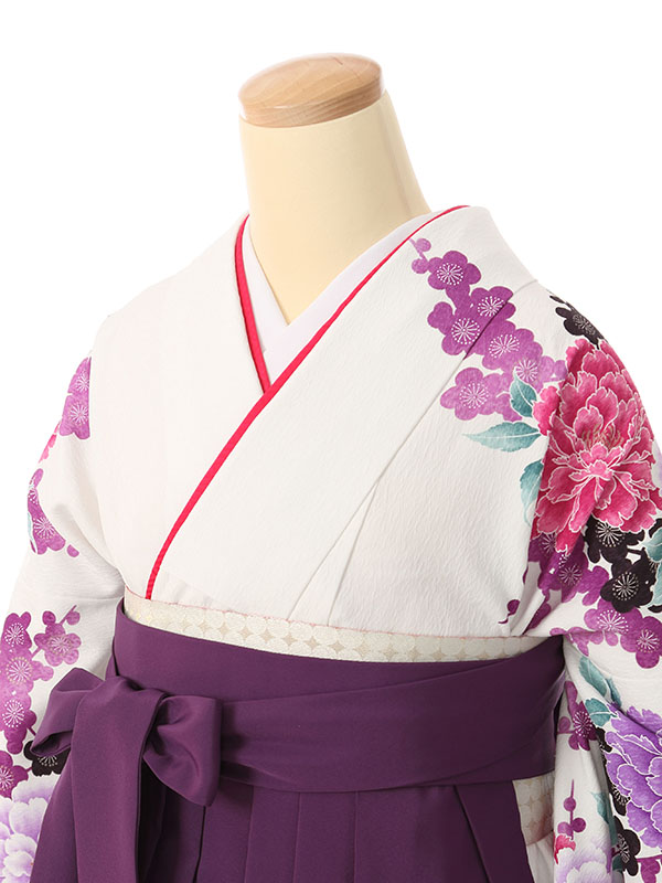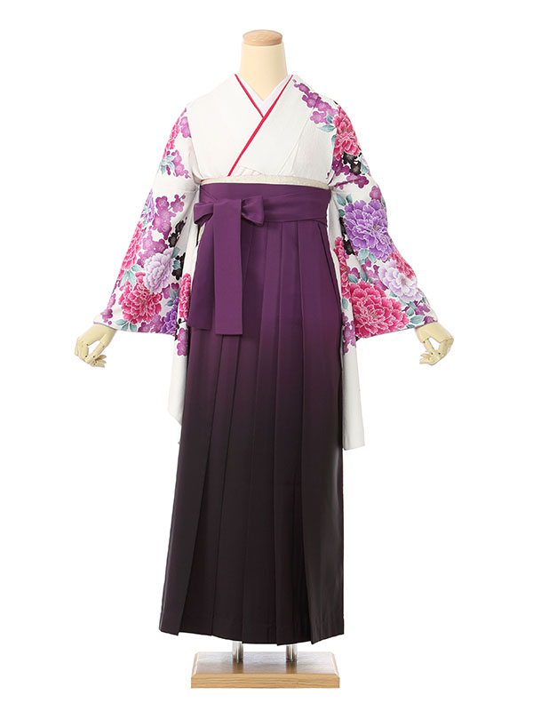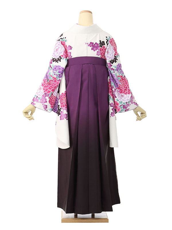 色/柄 着物:MERCURY DUO 小振袖 白地 牡丹と梅 袴:紫ぼかし袴