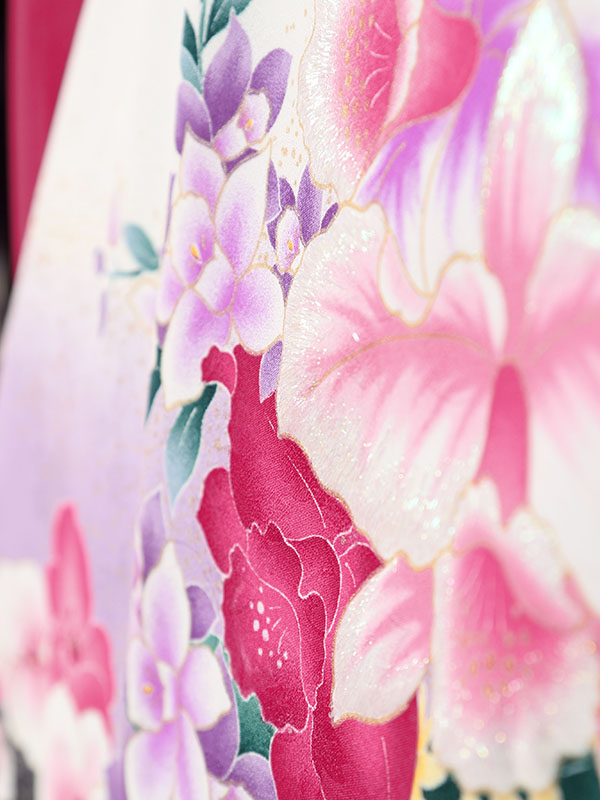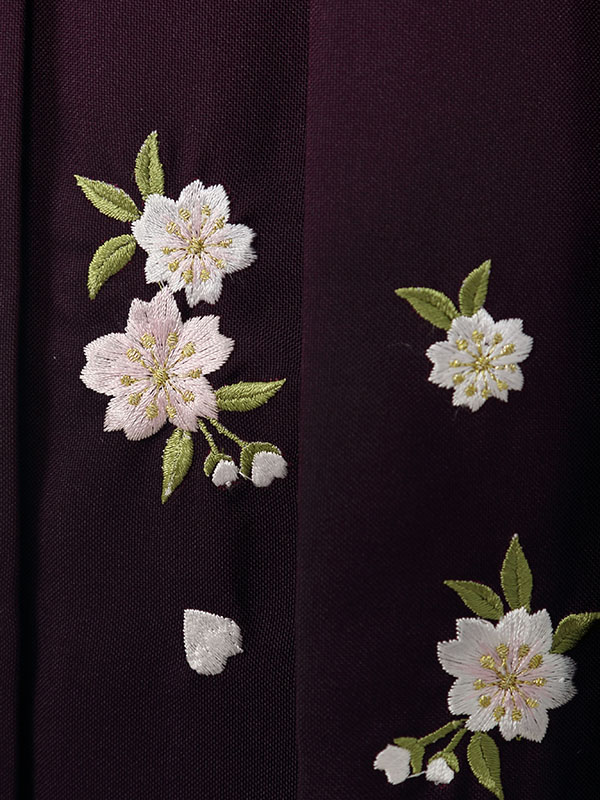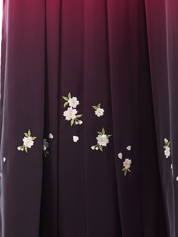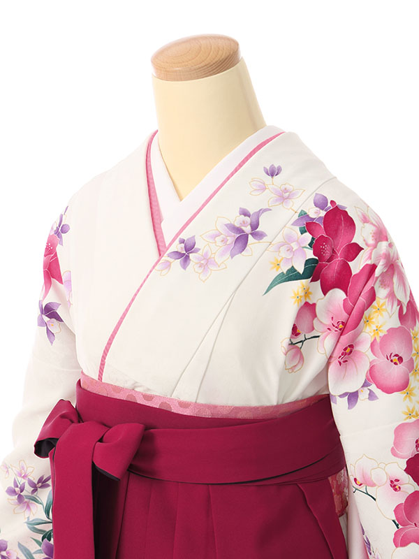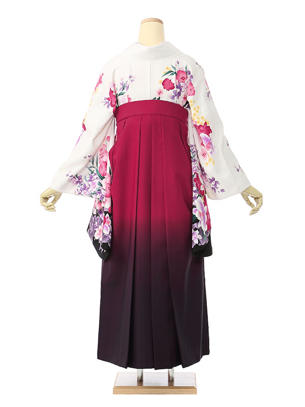 着物: 白地 袖下黒 蘭 袴: 赤紫地 紫ぼかし袴 桜刺繍