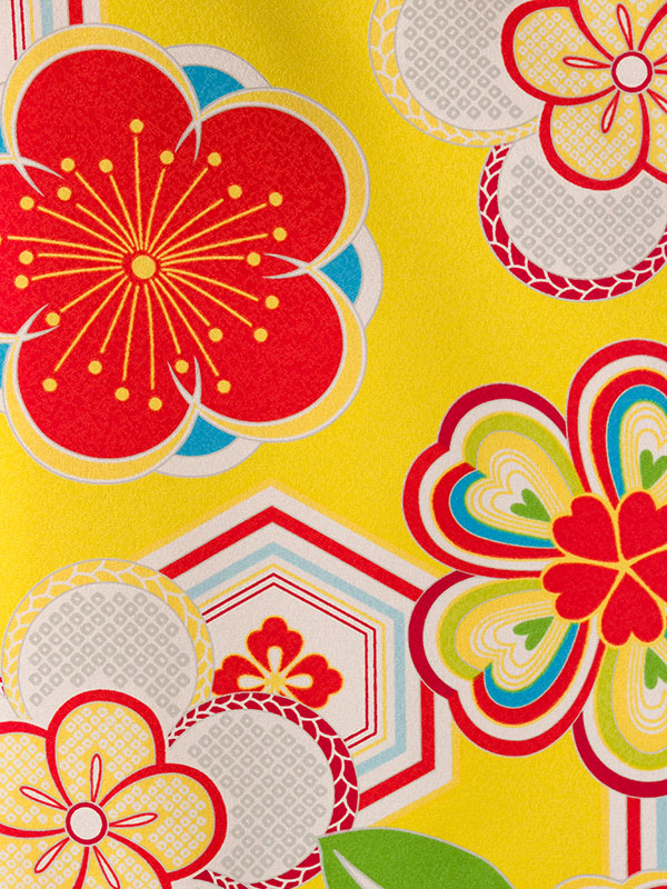 ■着物:黄色地 亀甲 梅 椿 橘 小紋