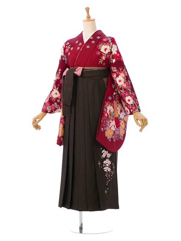 ■着物:エンジ 桜づくし ラメ刺繍の桜■袴:茶色袴 桜刺繍 ラインストーンつき 2.4 袴丈:90cm