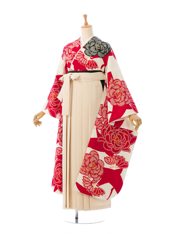 ■着物: オフ白地 赤黒 疋田牡丹に鶴 上絵羽柄