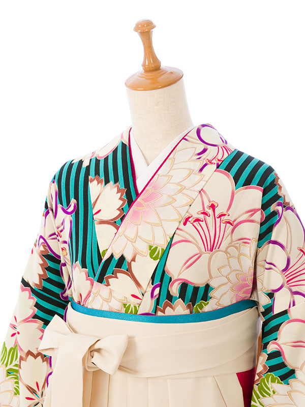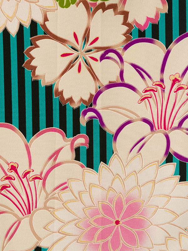 ■着物: 紅一点 ターコイズ 黒ストライプに百合