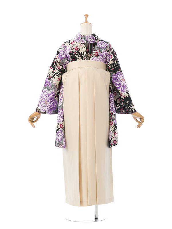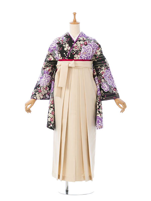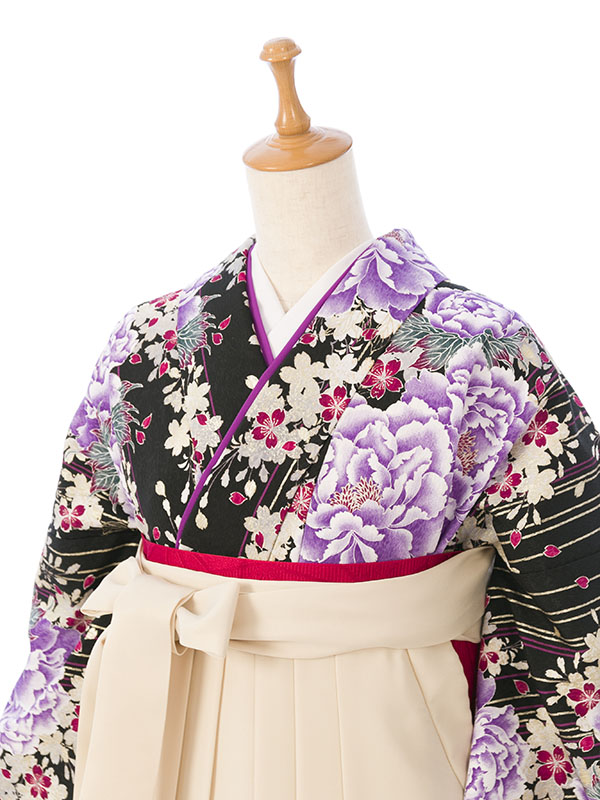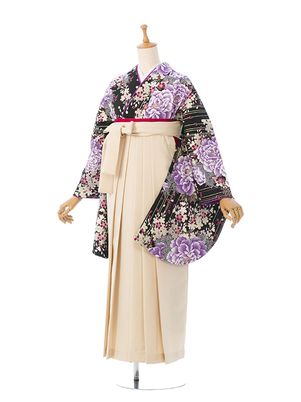 ■着物:黒地 牡丹 桜 金彩■袴:アイボリー袴 95cm