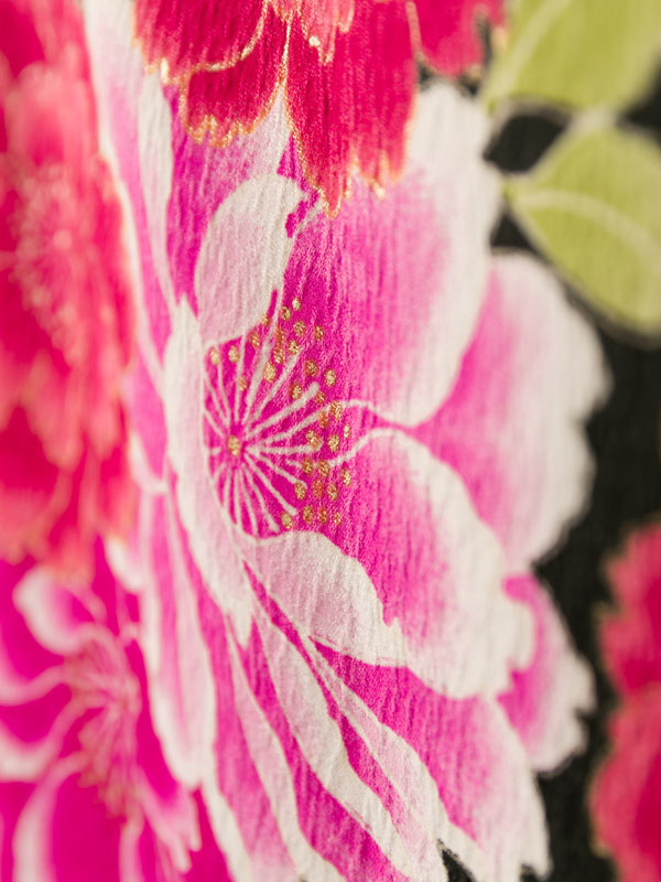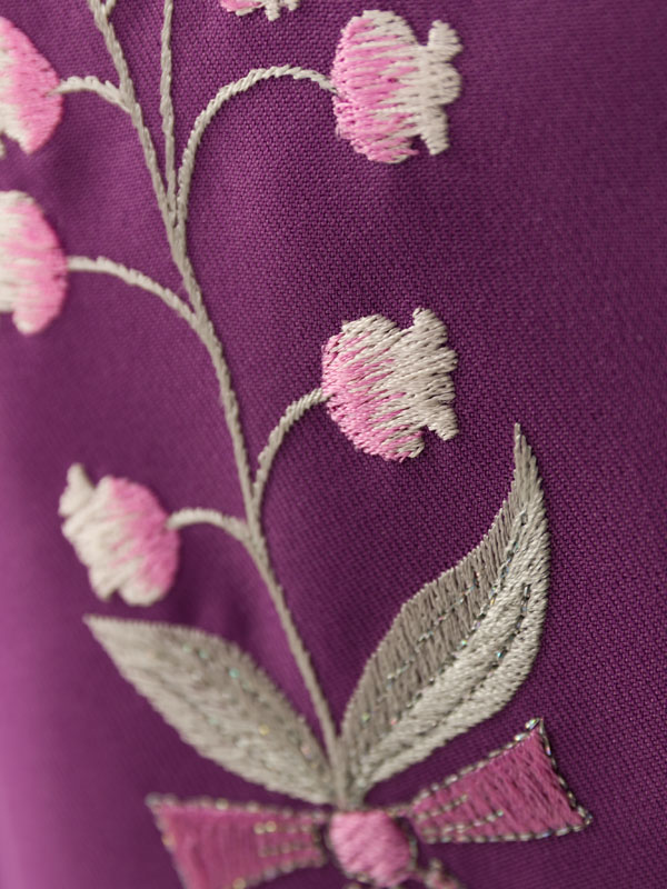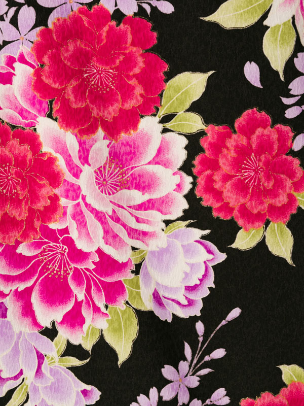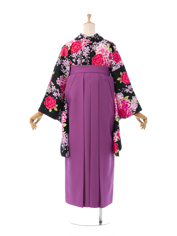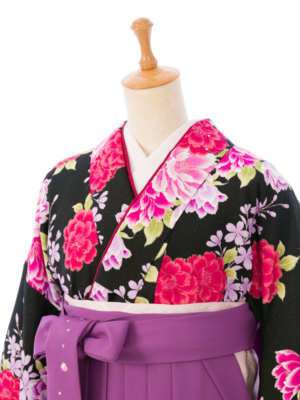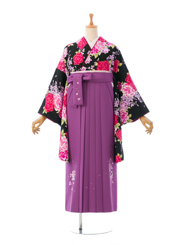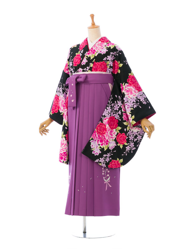 ■着物:黒地 牡丹 桜 金彩 スワロフスキー■袴:薄紫袴 鈴蘭刺繍 91cm
