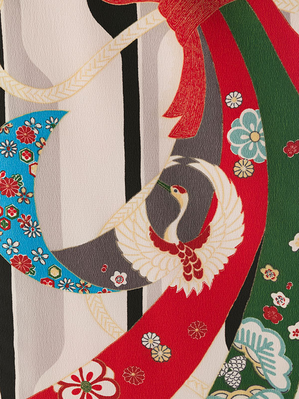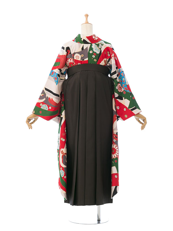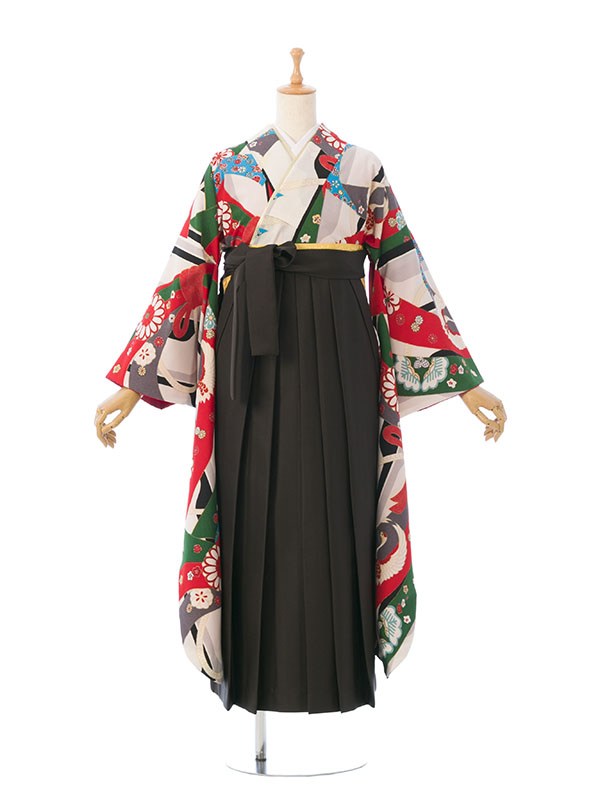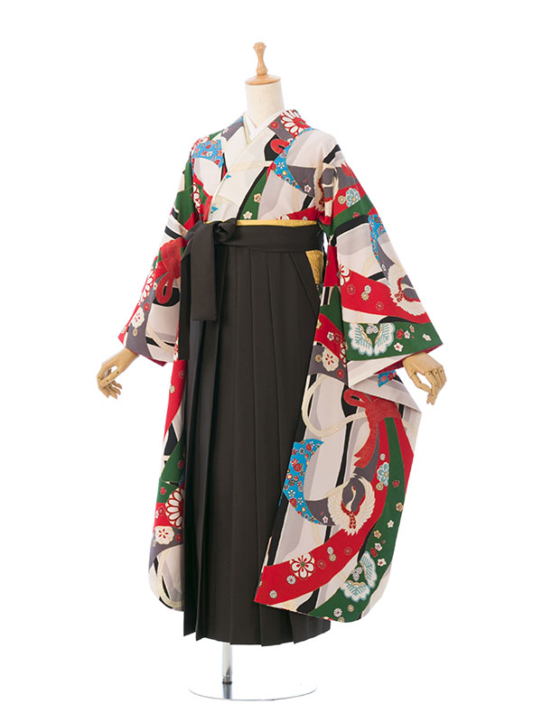 ■着物:モダンアンテナ 白/薄グレー縞に束ね熨斗 鶴 ■袴:チャコール袴 91cm