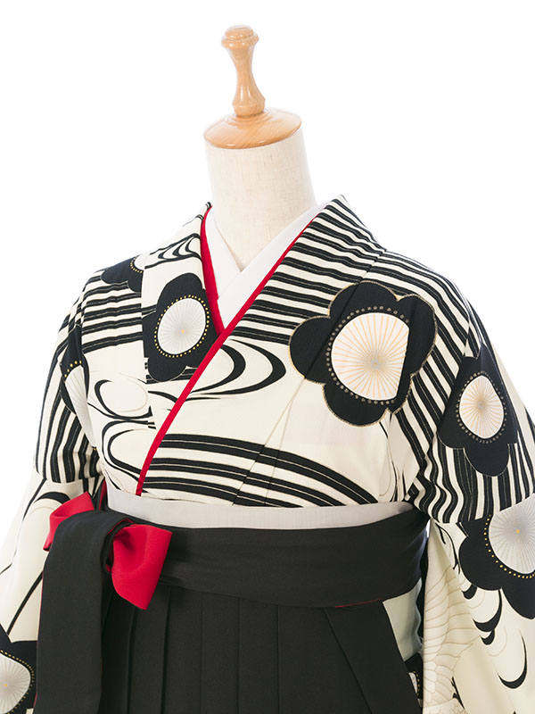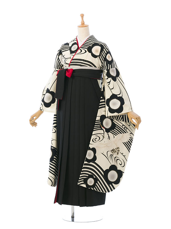 ■着物:白黒地 鶴梅 流水■袴:黒×赤袴 バイカラー 91cm