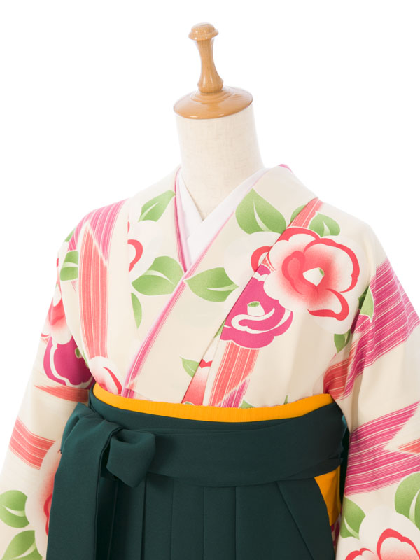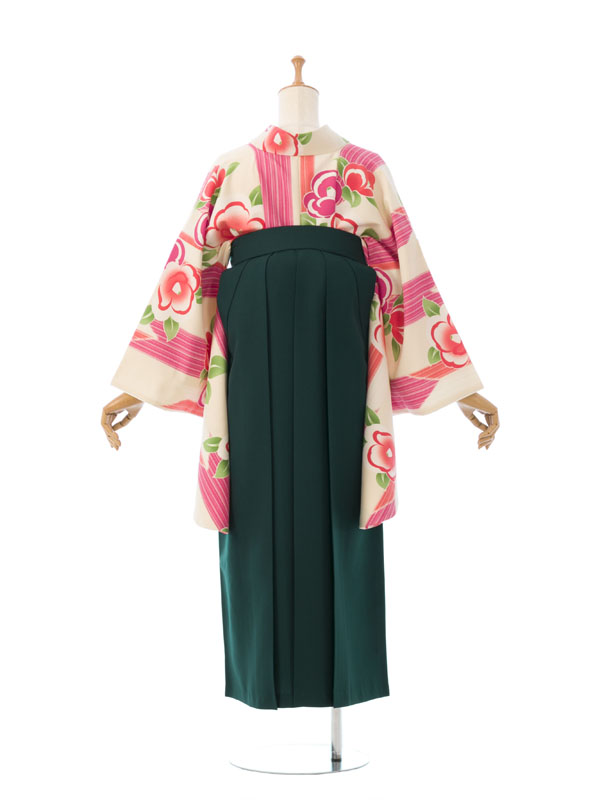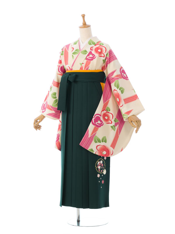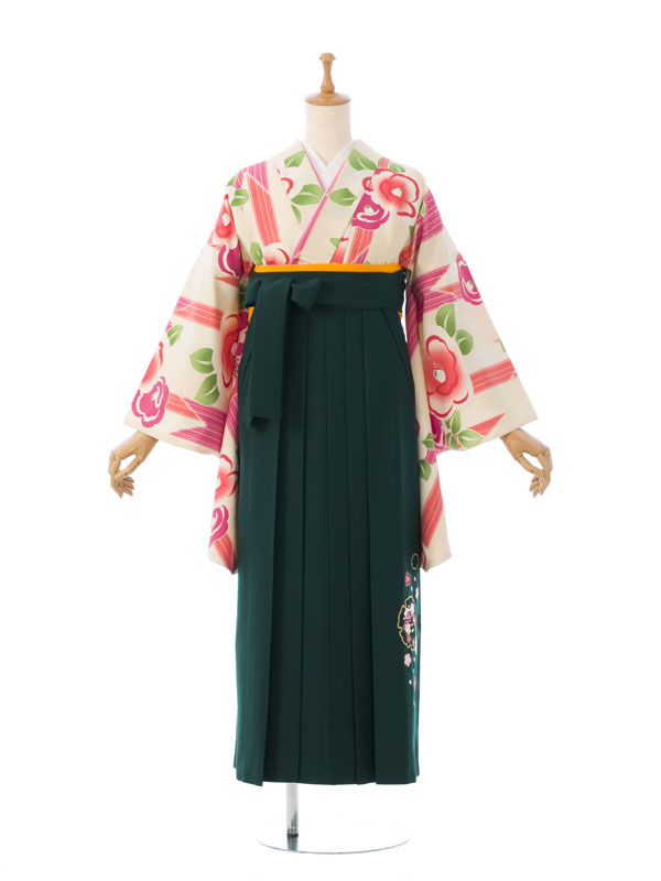■着物: クリーム地 矢絣に椿■袴: グリーン袴 雪輪に梅刺繍 91cm