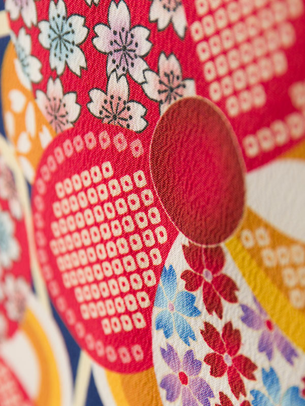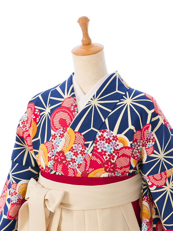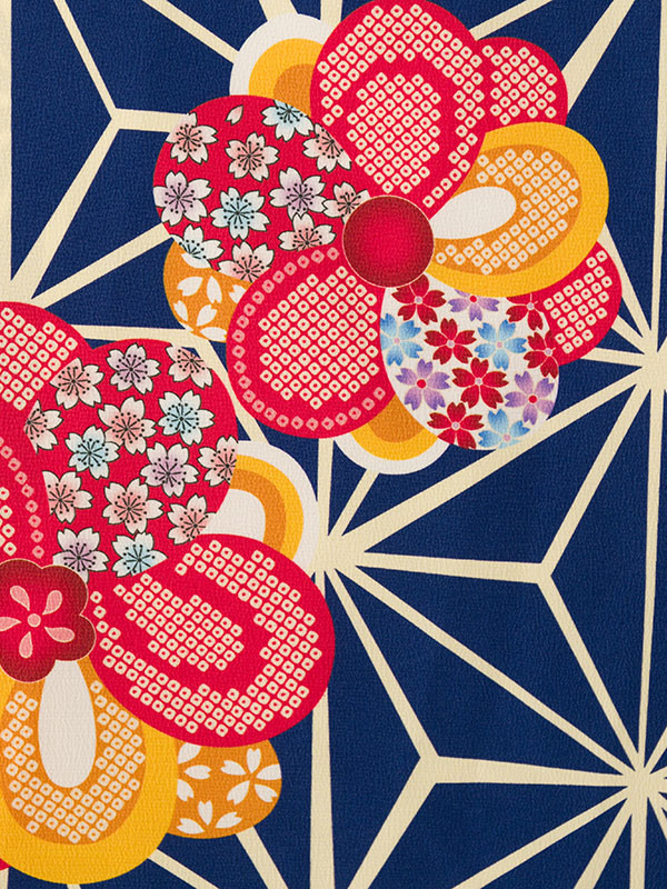 【色/柄】着物:紺地 麻の葉に華紋