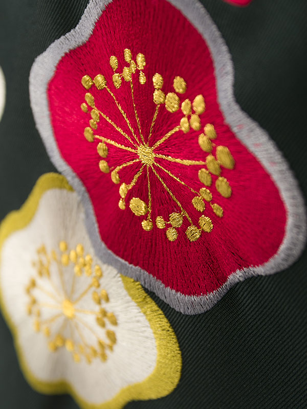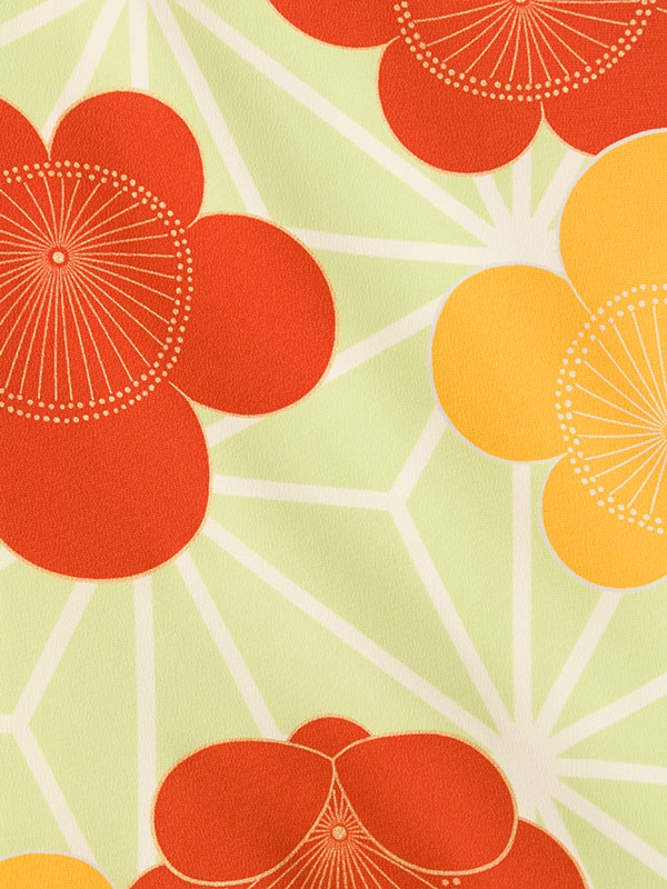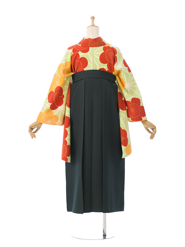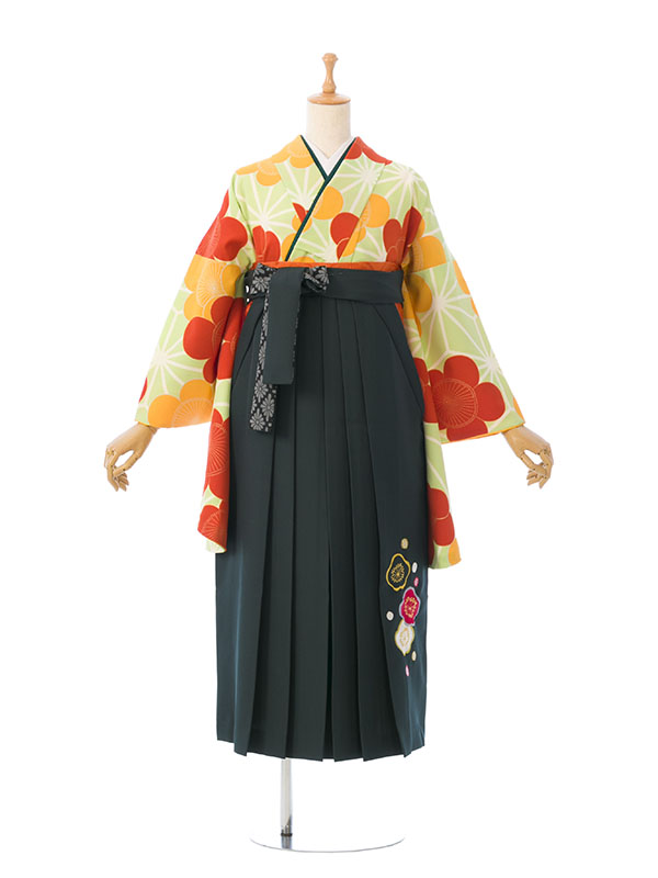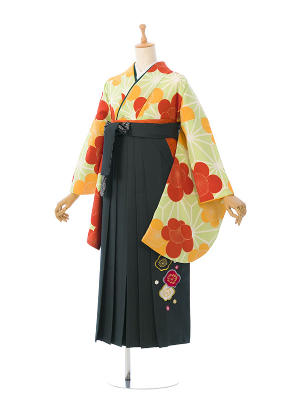 ■着物: 黄緑地 麻の葉に梅 ■袴: グリーン袴 梅刺繍 87cm