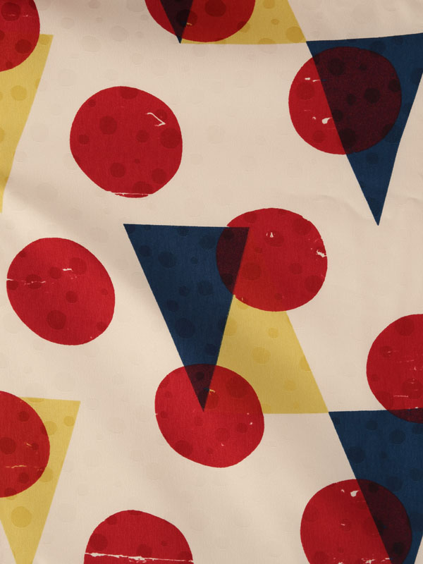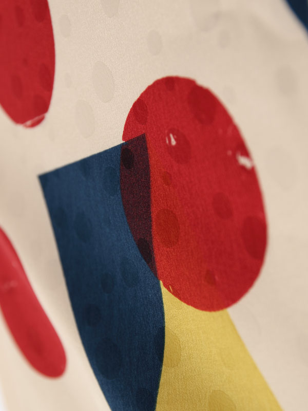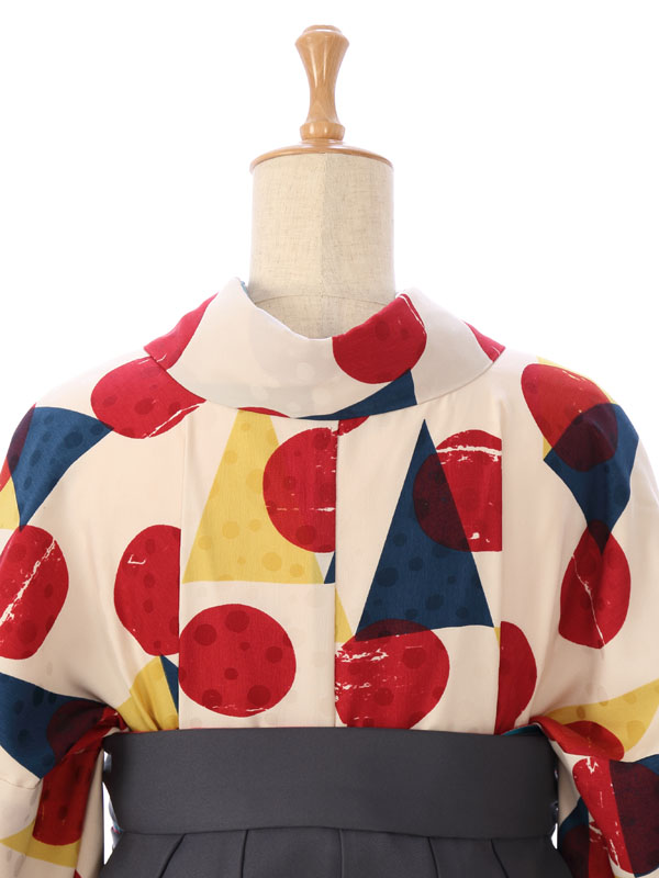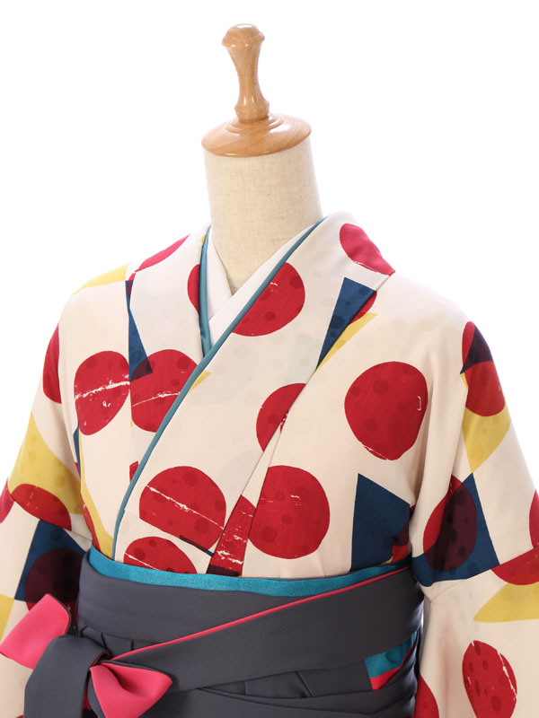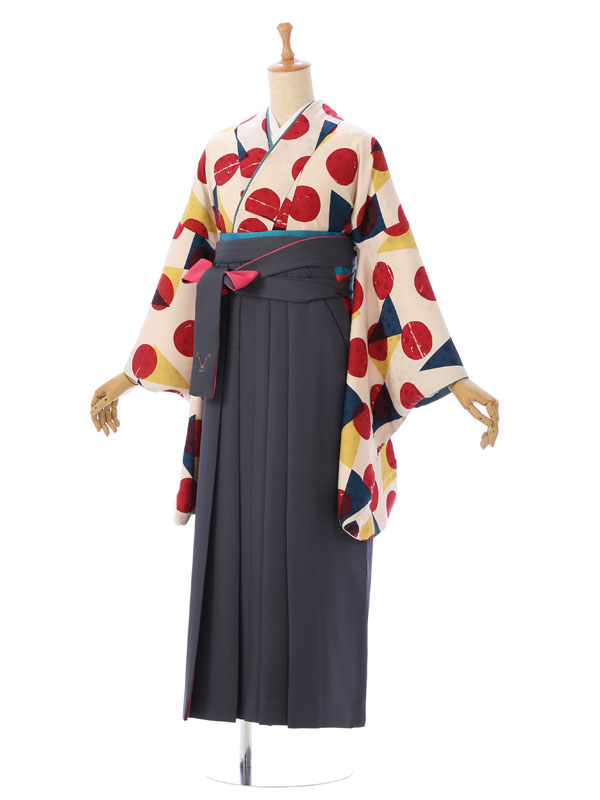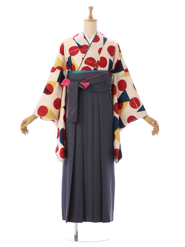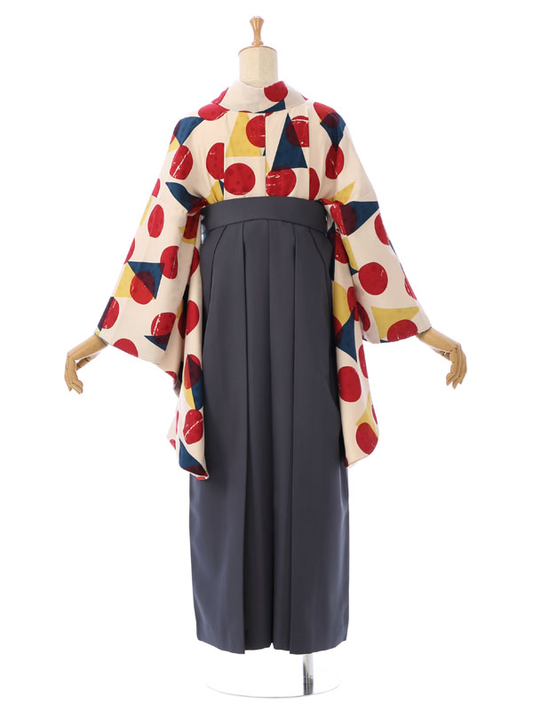 ■着物:白地 赤青 幾何学文様■袴: アコーディオンタイプ グレー×ローズピンク袴