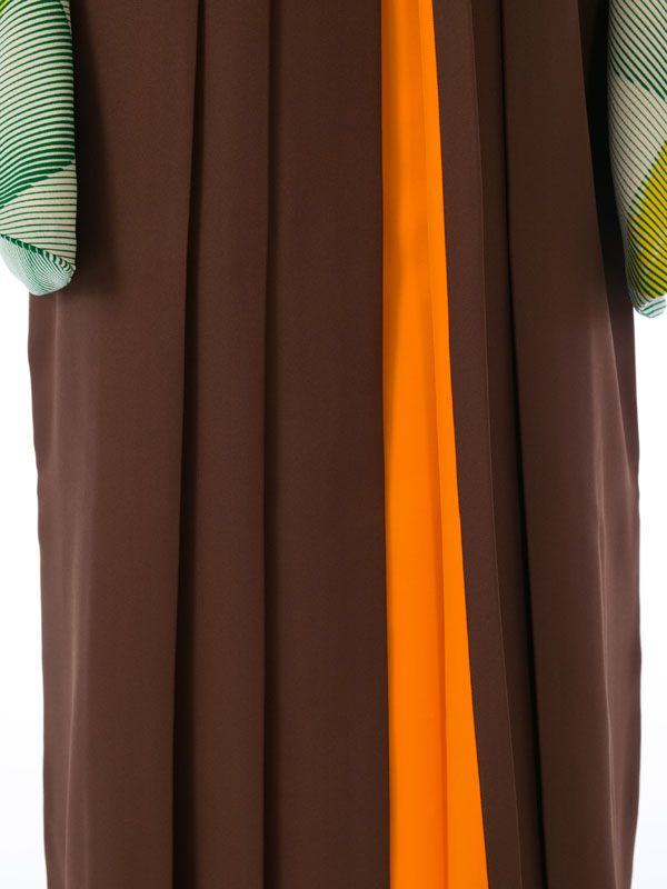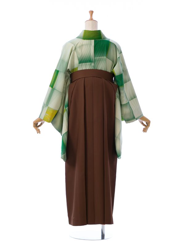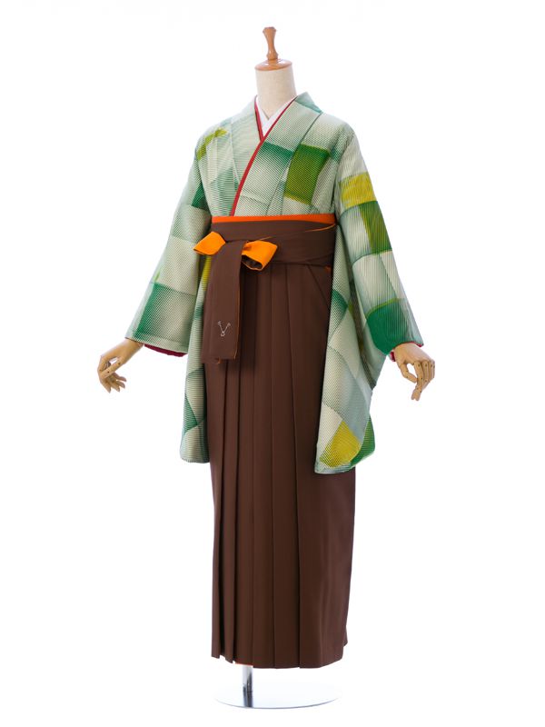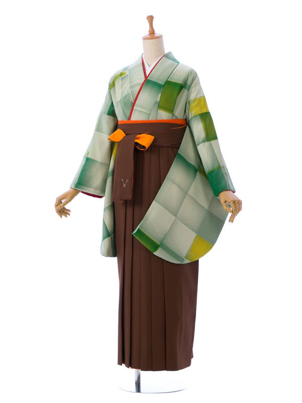 ■着物:クリーム 緑 格子■袴:茶色×オレンジ袴 バイカラー アコーディオンタイプ