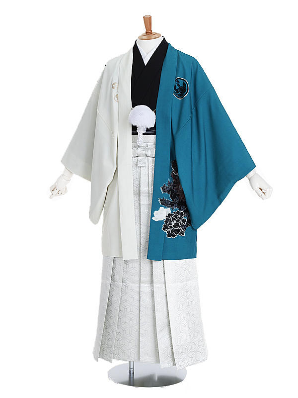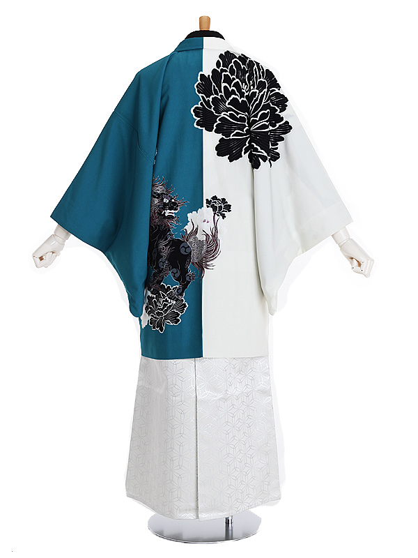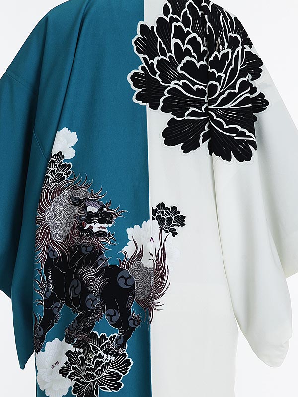 羽織/着物:白|青緑地牡丹獅子