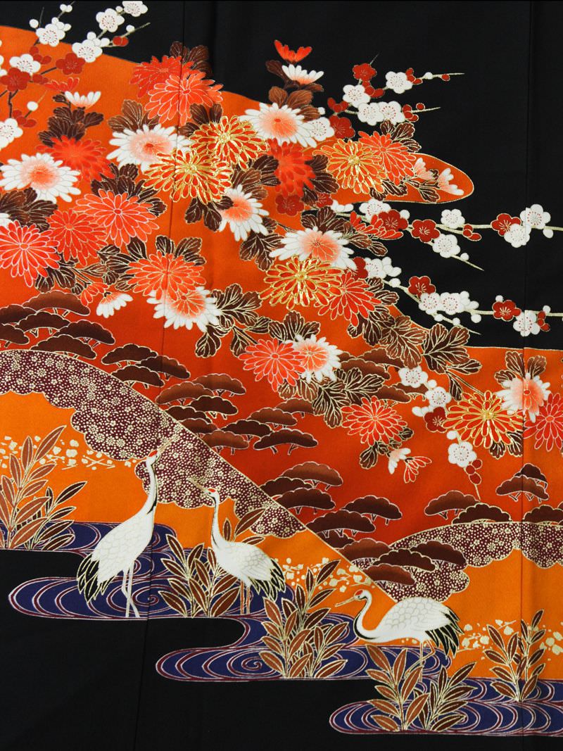 ■色/柄 レンガ色地菊に梅三階松立鶴