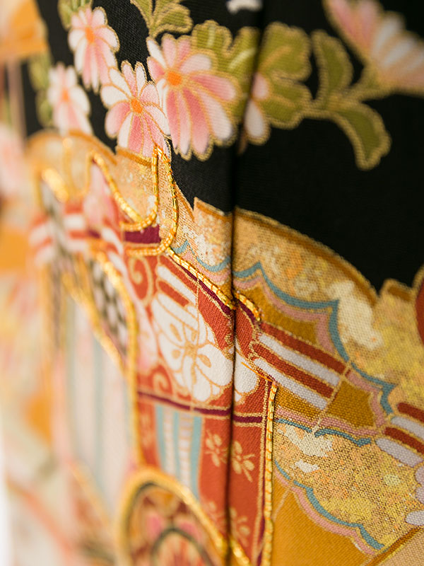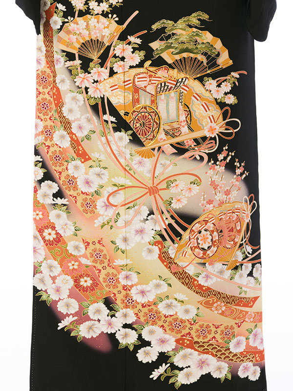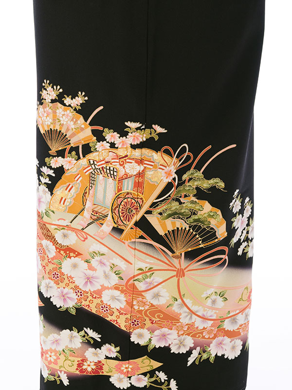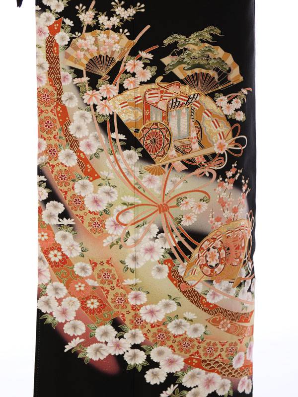 熨斗に扇面文 松竹梅などの縁起の良い吉祥文様に金彩や金駒刺繍を用いた華やかな黒留袖です。