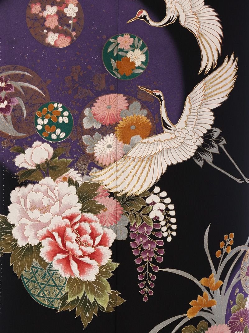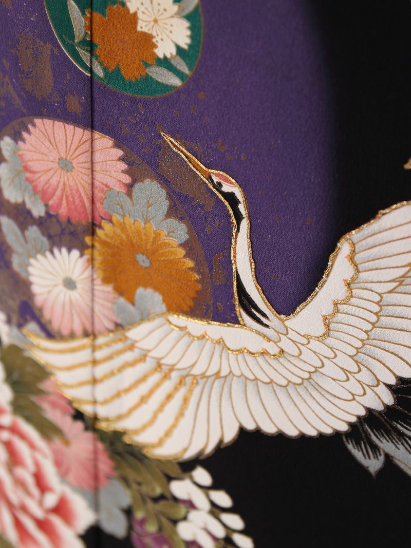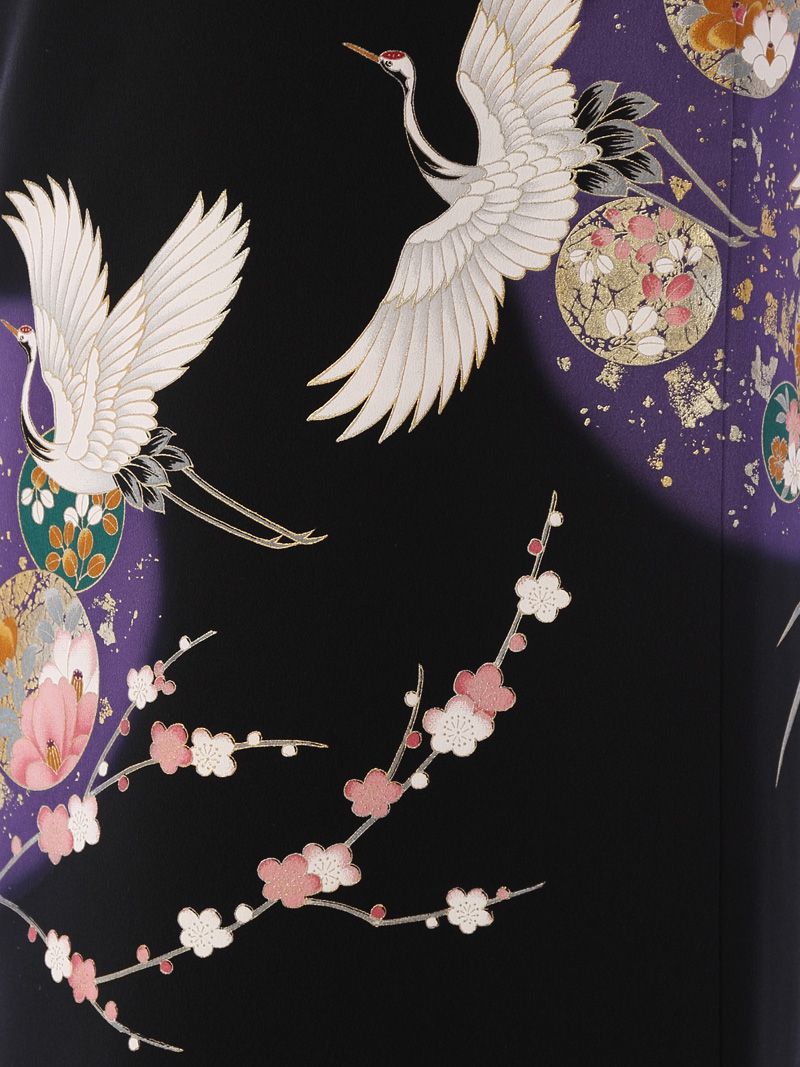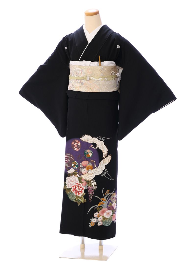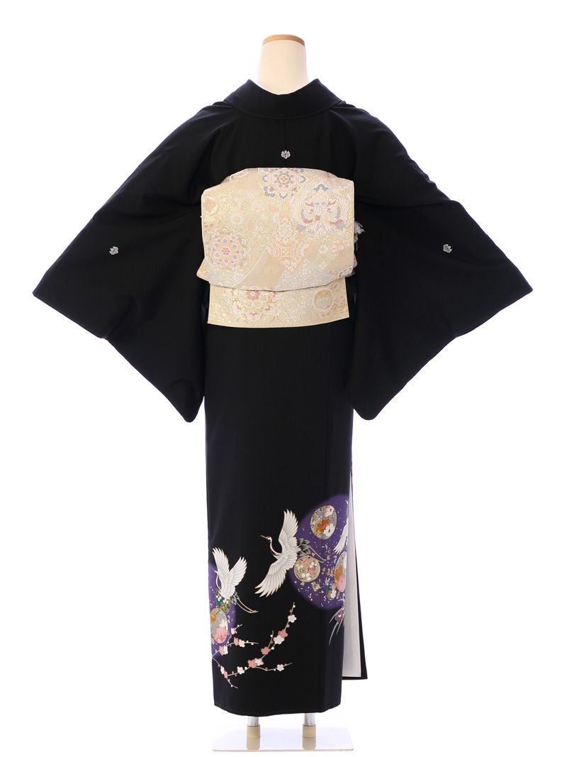黒留袖:紫丸ぼかしに飛翔鶴 花丸紋に花籠