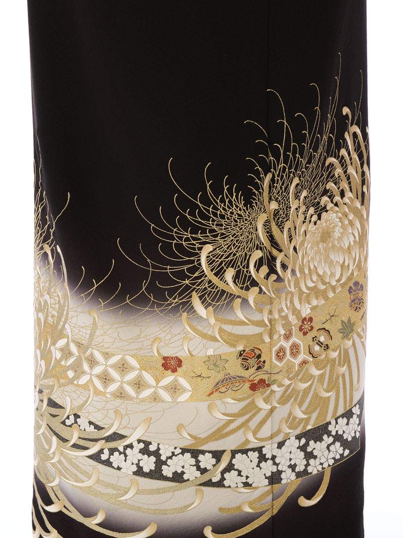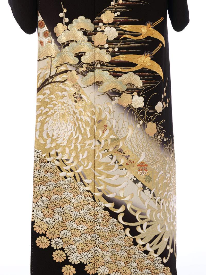 日本有数の着物の産地である新潟県十日町で丁寧につくられた友禅 [ことほぎ]ブランドの留袖です ふんだんにあしらわれた金糸 箔で描かれたおめでたい菊に夫婦鶴 お慶びの席にふさわしい高級感あふれる豪華な逸品です[MP-0006]