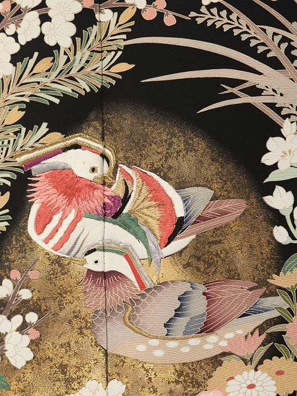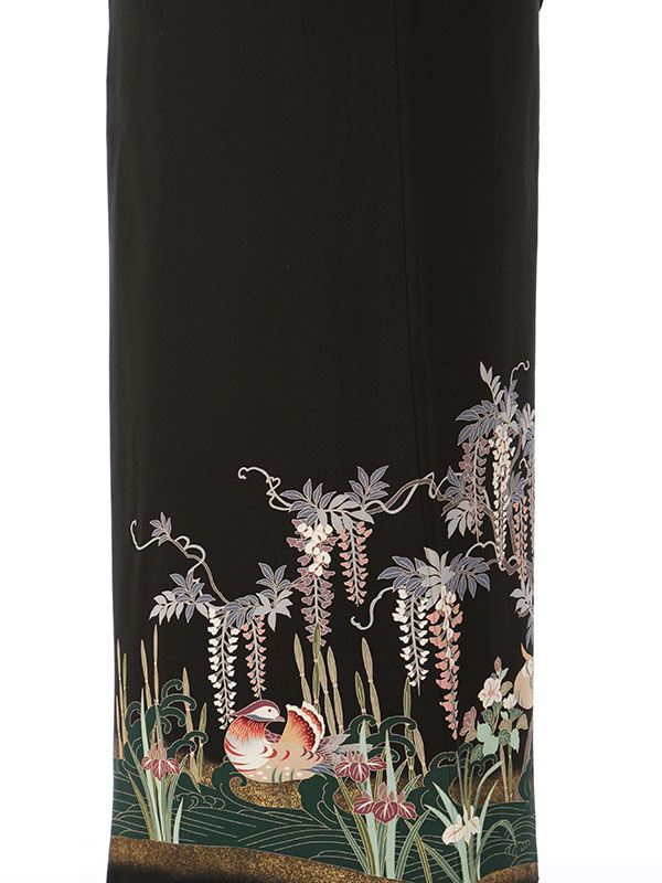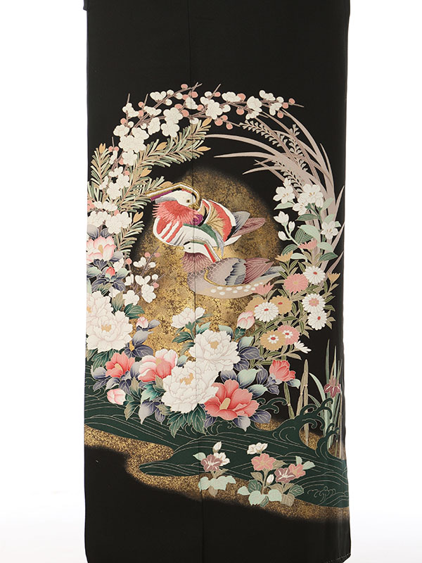 黒留袖: 金箔の中おし鳥 緑の波 花