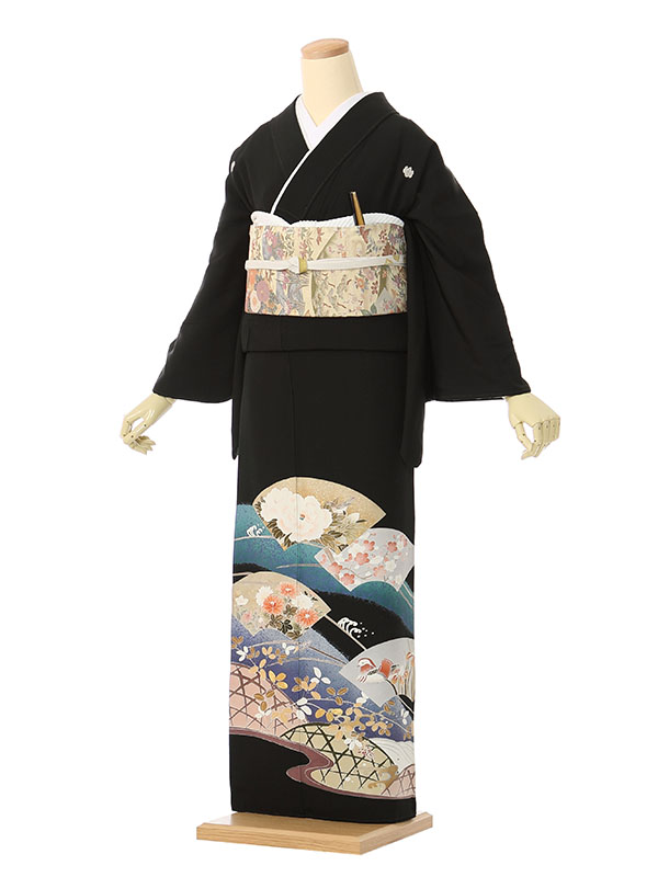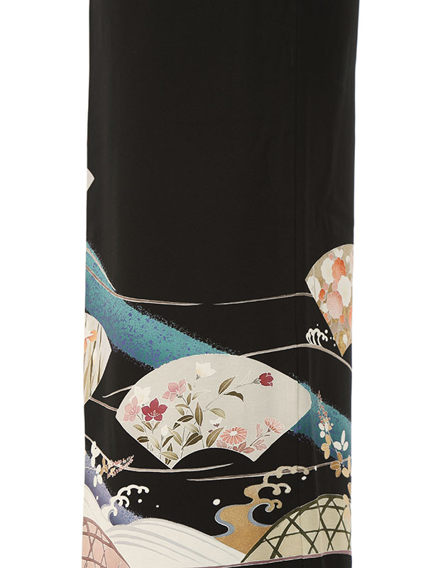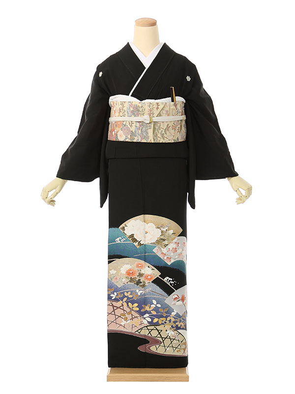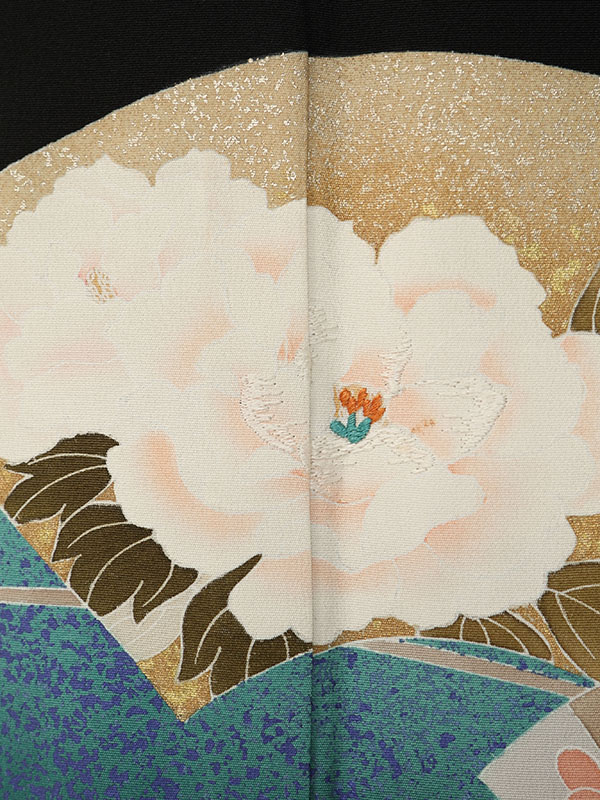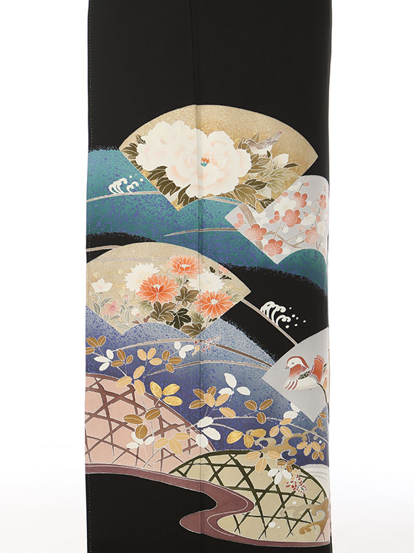 黒留袖: 扇面の中牡丹 ハギ垣根菊