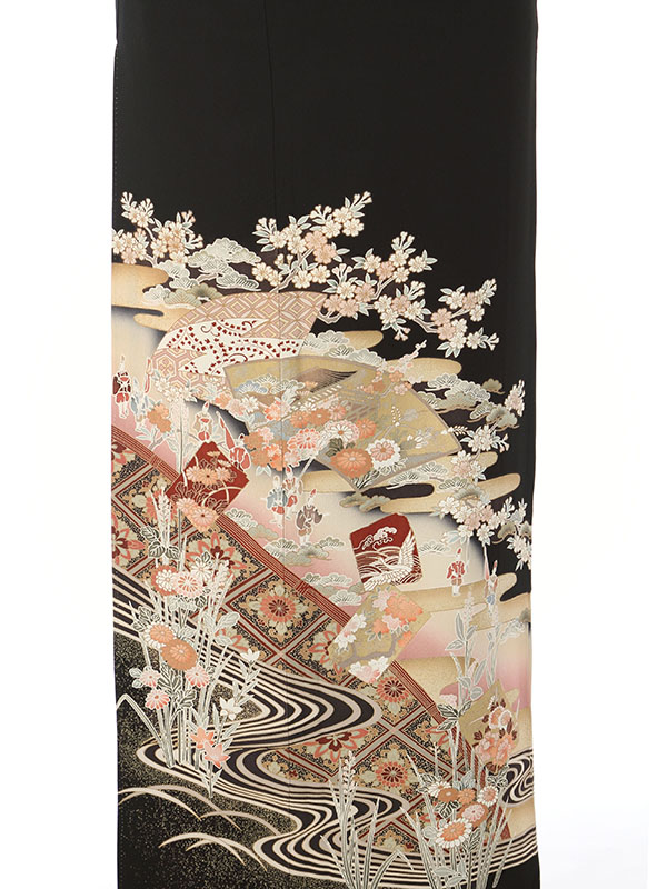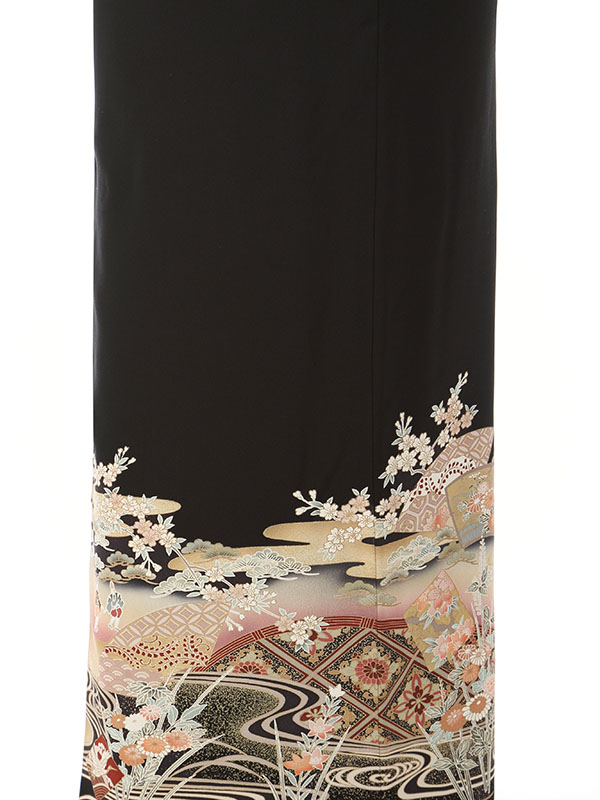 黒留袖: 流水 垣根 扇面 桜 紫