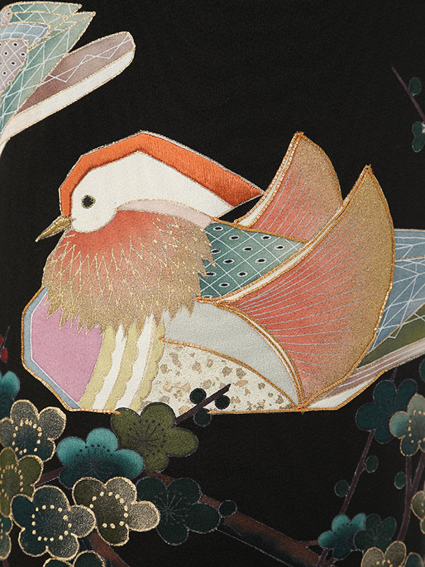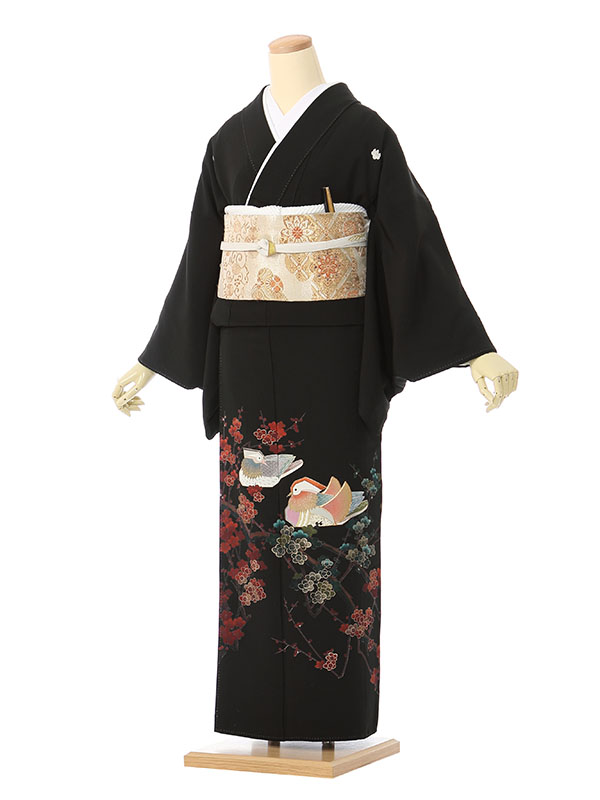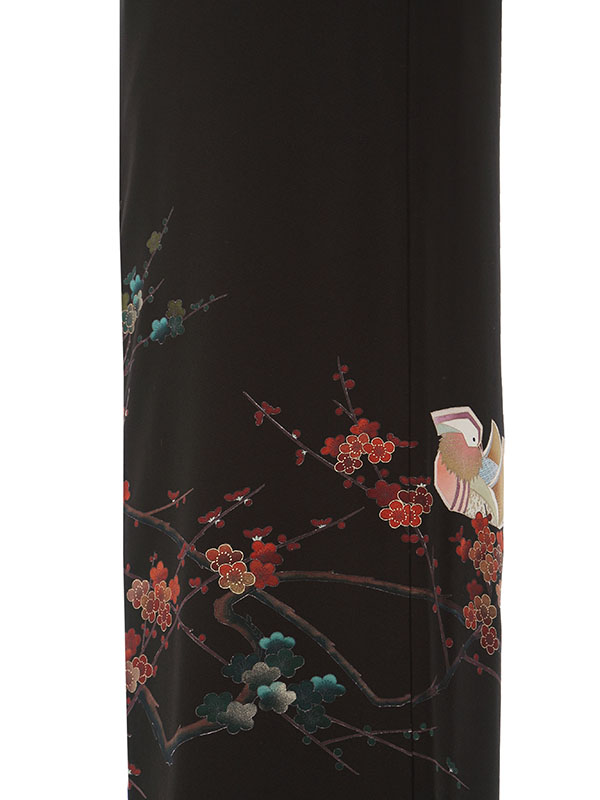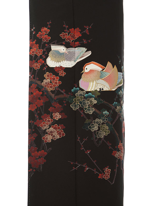 黒留袖: 手書の梅の木おしどり2羽