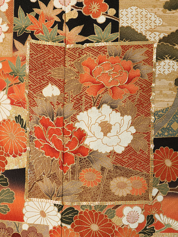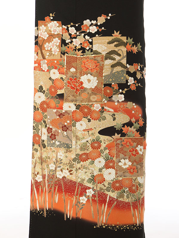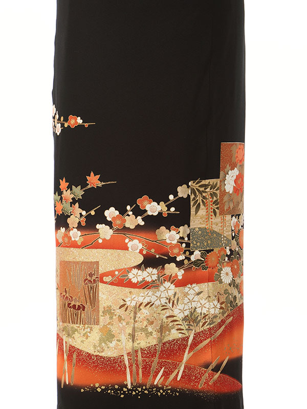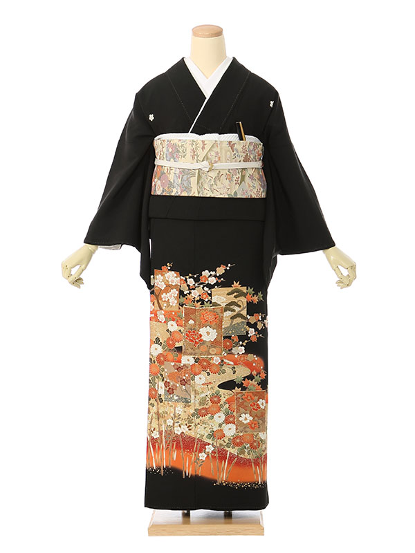黒留袖: オレンジ 菊 梅 椿 桔梗
