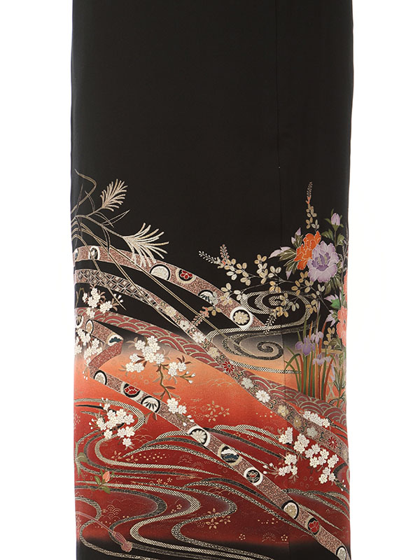 黒留袖: 小豆色ぼかし 花 束ねのし 流水