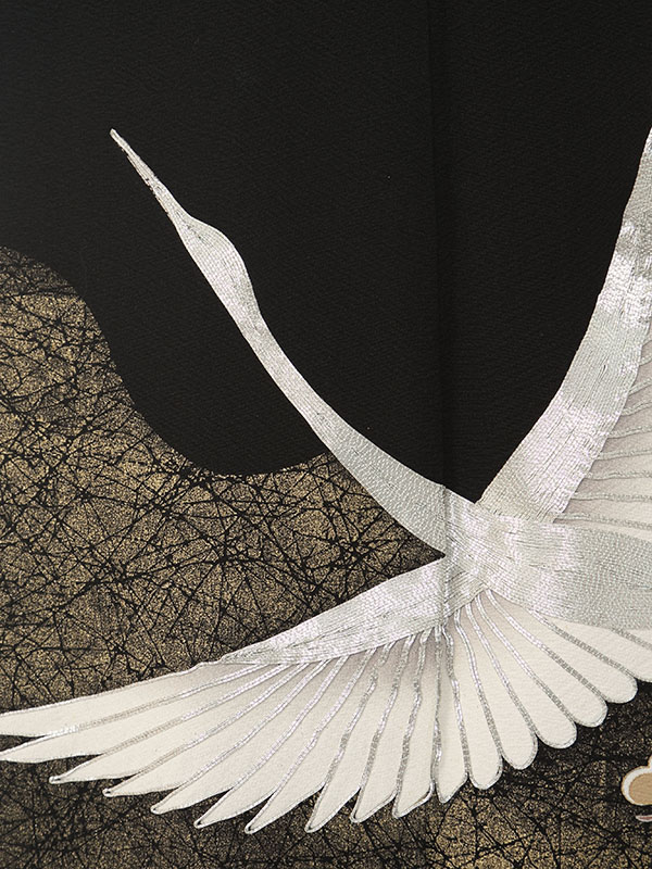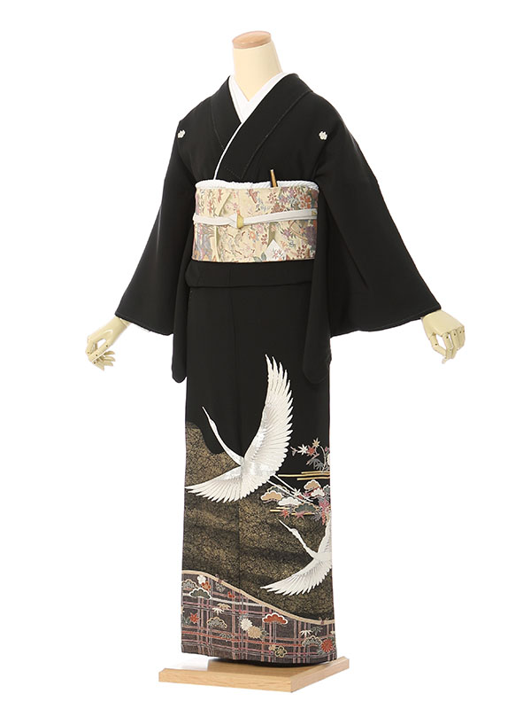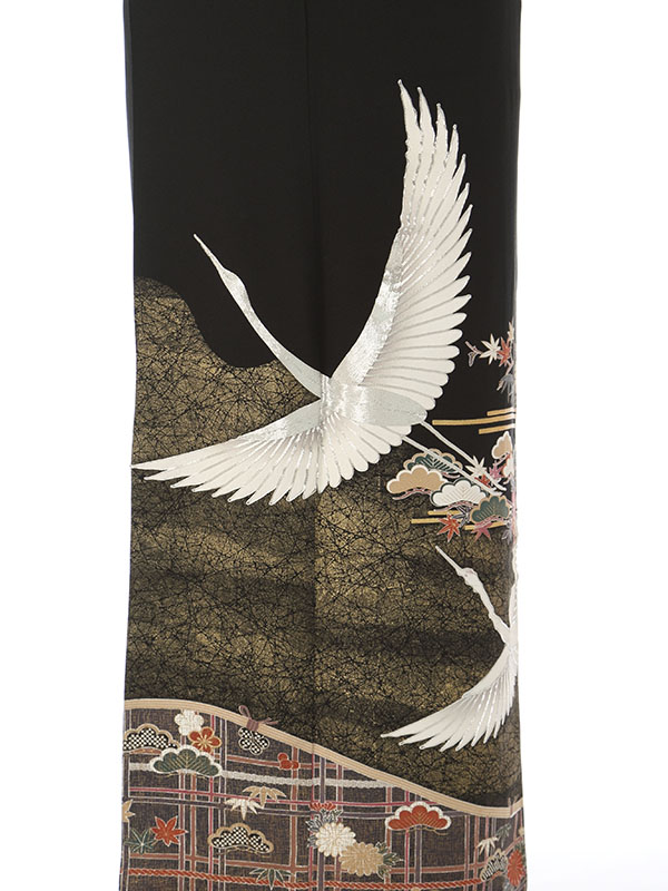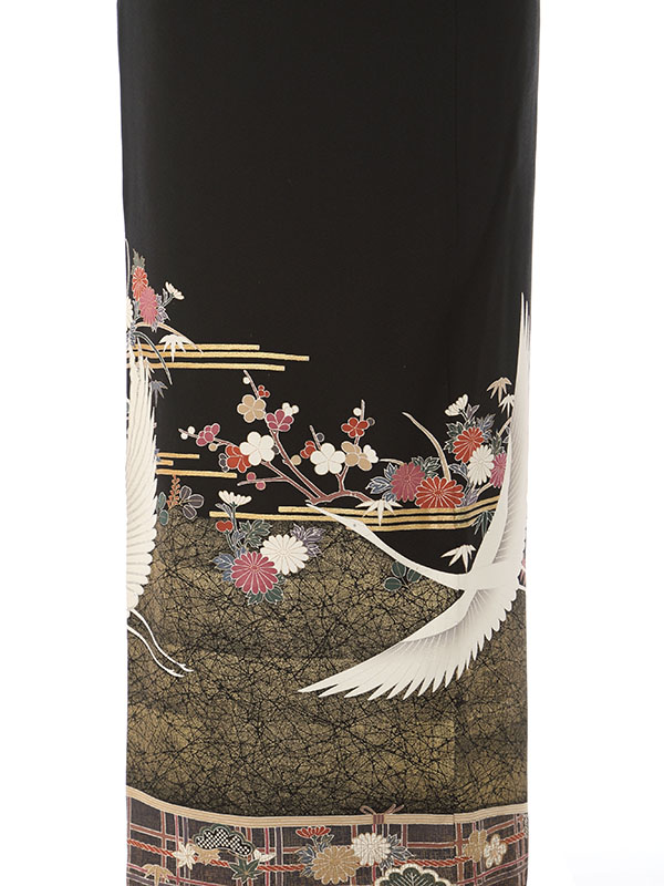 黒留袖: 黒地張金裾格子縞白銀縫鶴