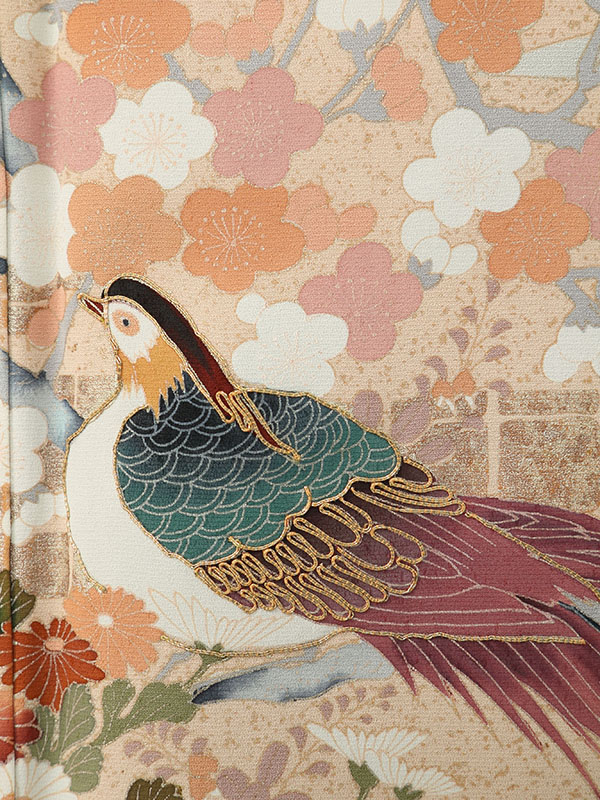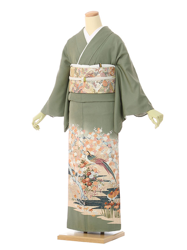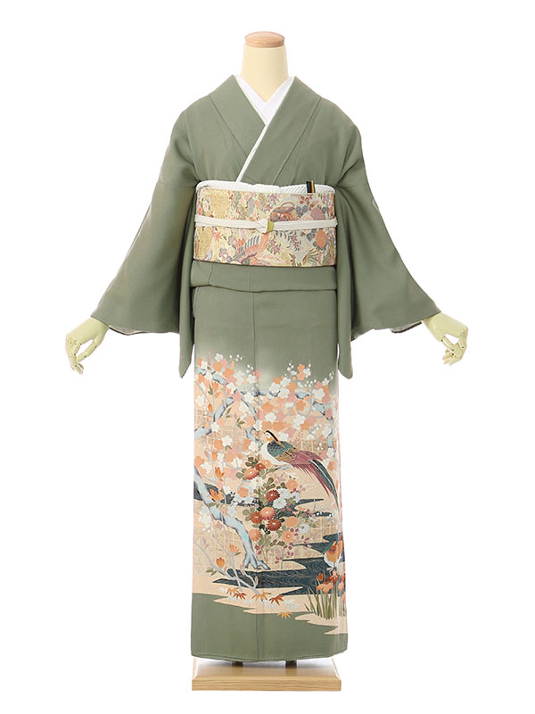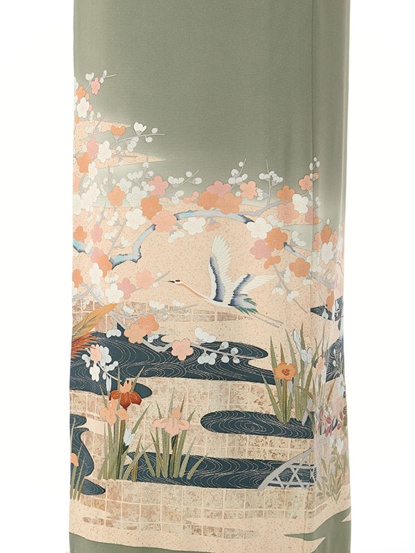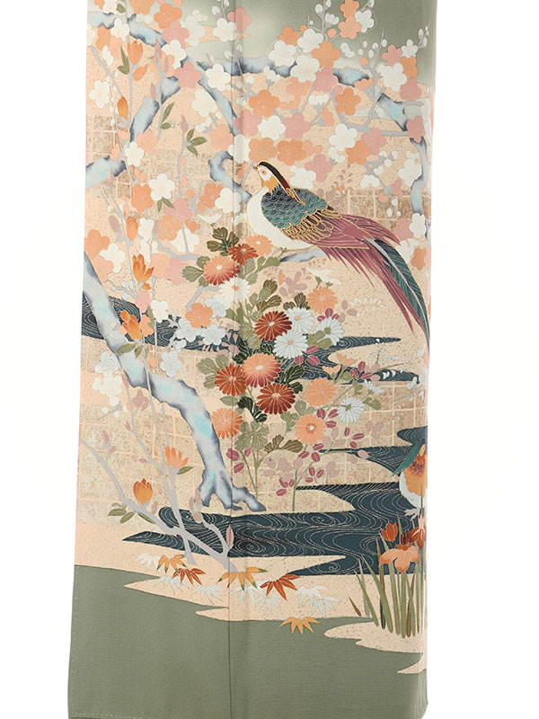 色留袖: 抹茶色梅にキジ裾アヤメ鶴