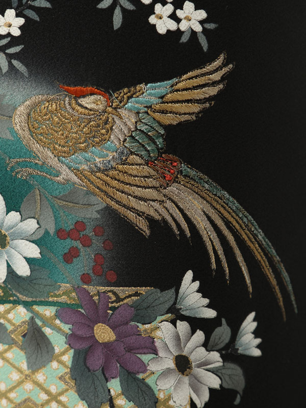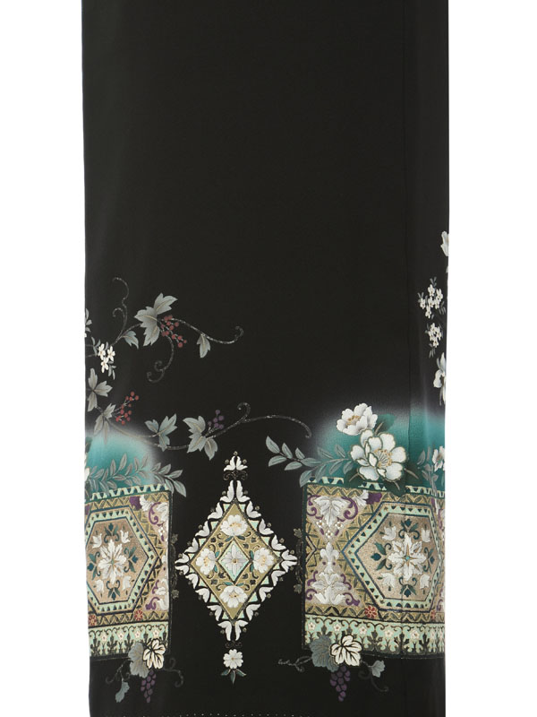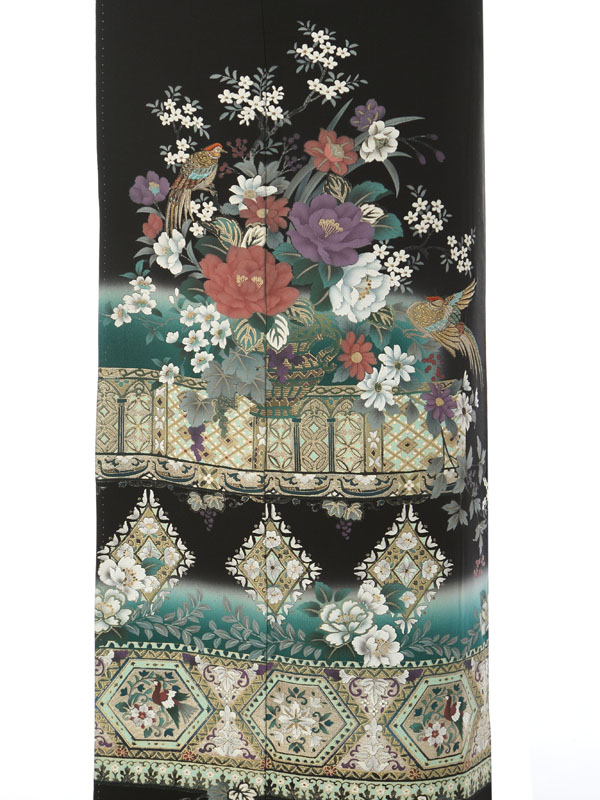 黒留袖: ブル-地エジプト柄 花 金鶏鳥