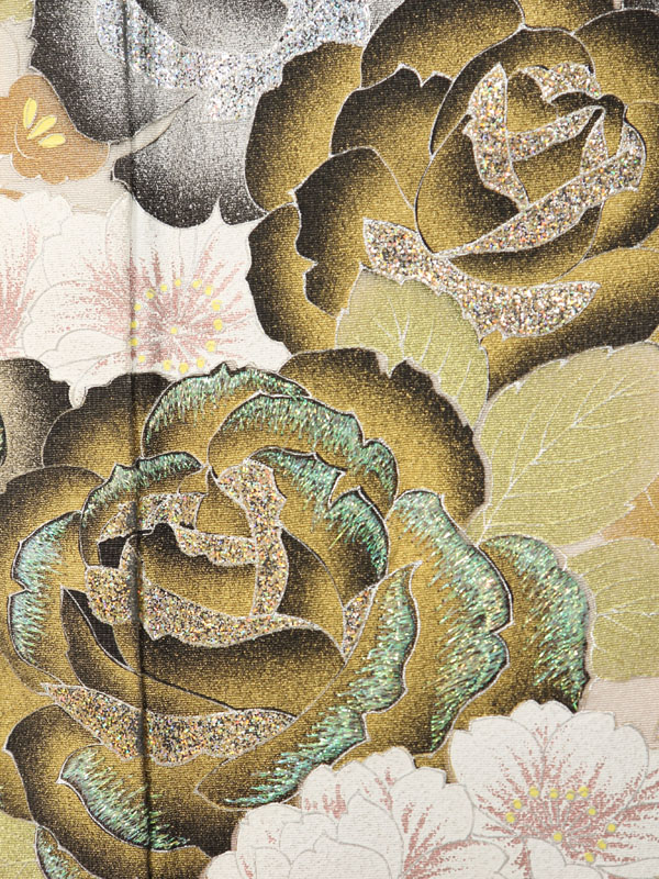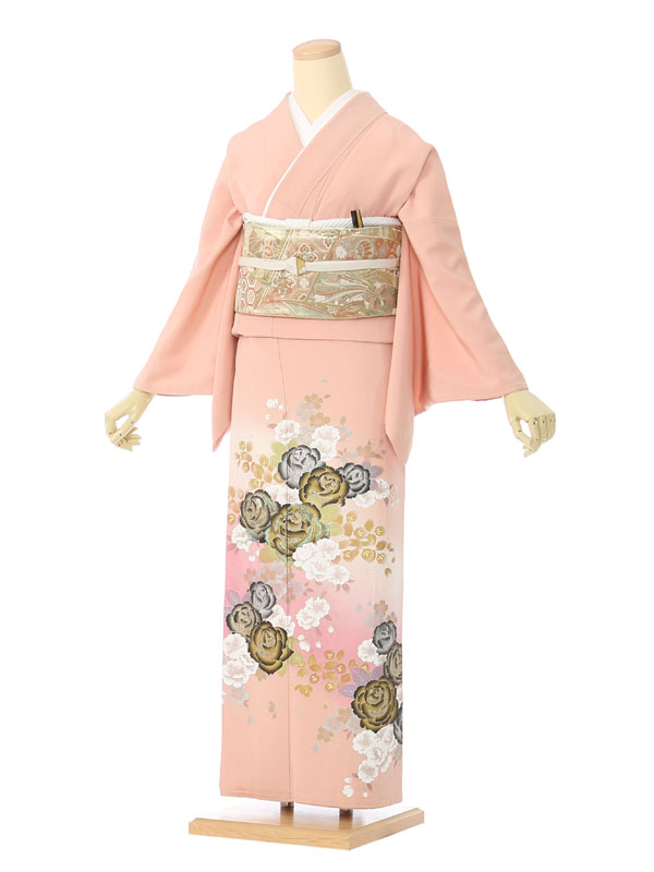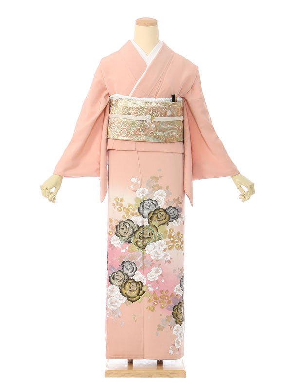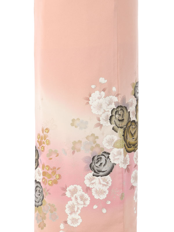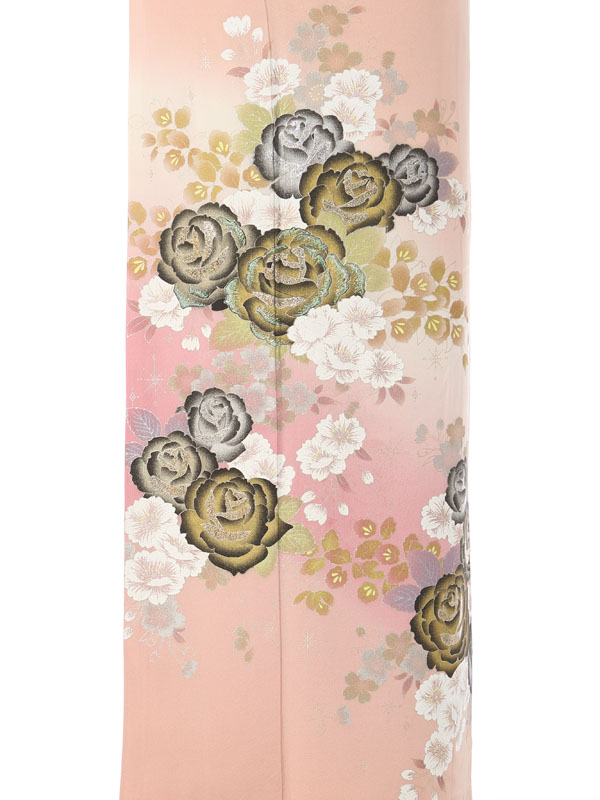 色留袖: ピンク地 銀と金のバラ 八重桜