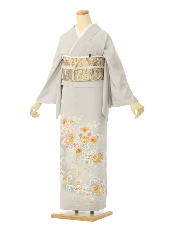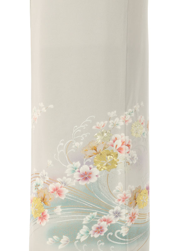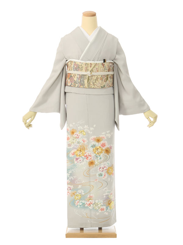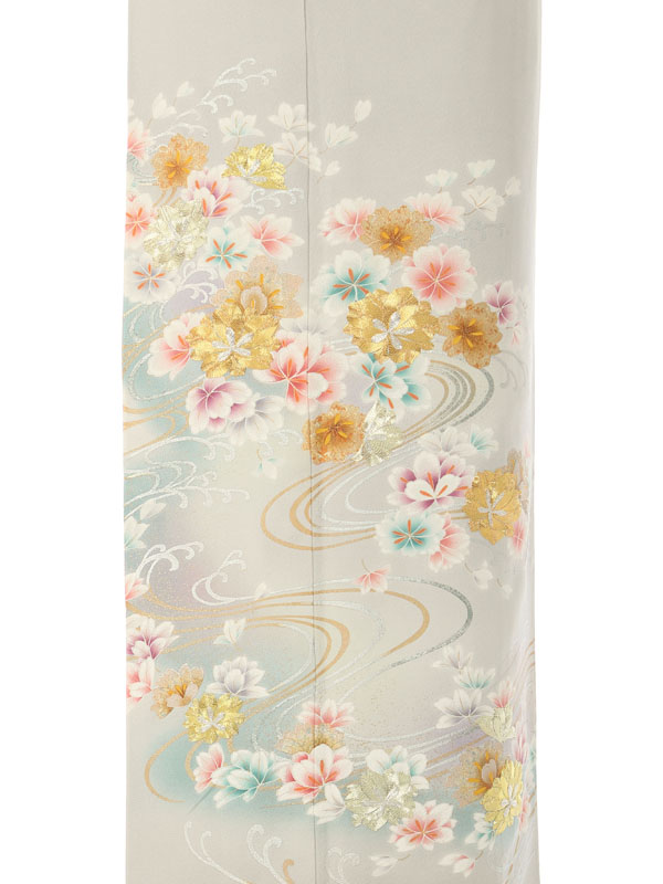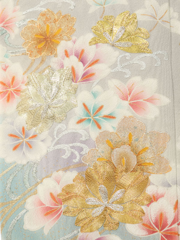 色留袖: グレー地 水色ぼかし 流水 金糸花