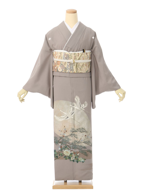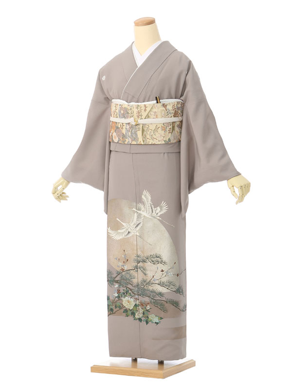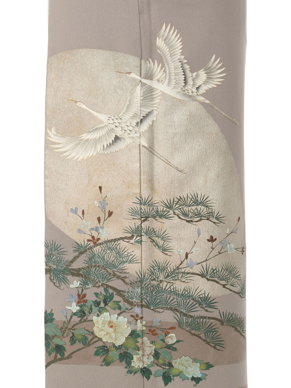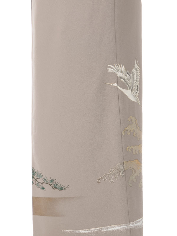 色留袖: グレ-地 金箔 鶴 五葉松 牡丹