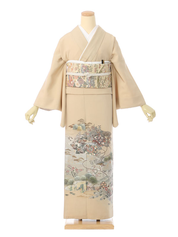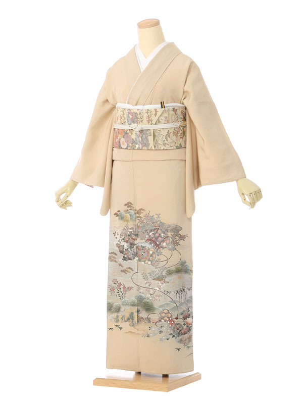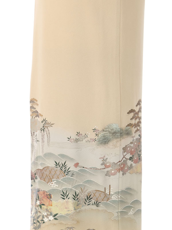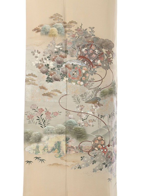 色留袖: ベ-ジュ 鼓 金の雲に下り藤