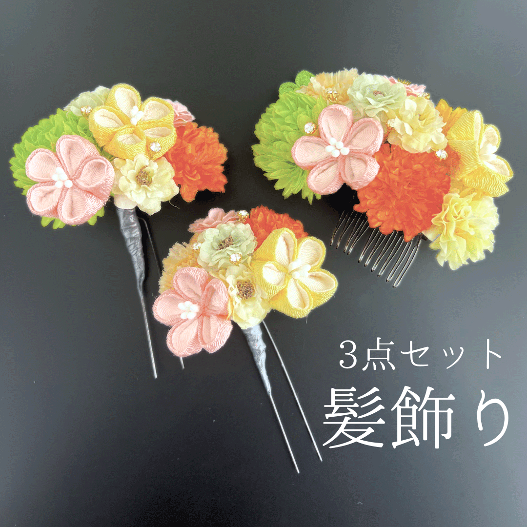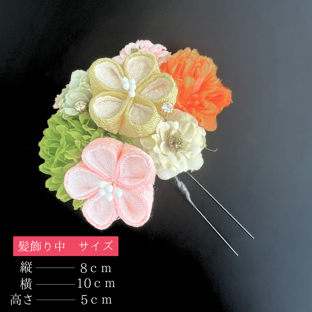 つまみ細工の桜、ピンポンマムなどの花々、ビジューもあしらわれ、華やかな雰囲気です。